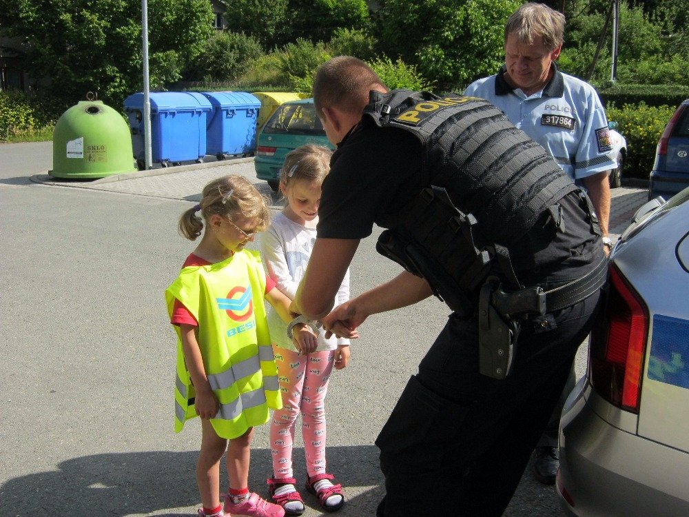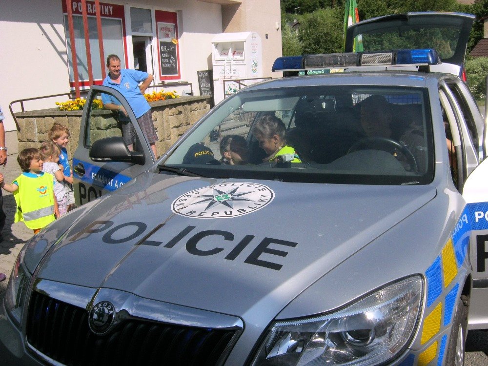 Téma Doprava jsme zakončili setkáním s policisty. Děti se nejprve trochu bály a ostýchaly, ale venku u policejního auta se osmělily. Vyzkoušely si pouta, obušek i policejní houkačku. Sezení v autě se jim náramně líbilo.