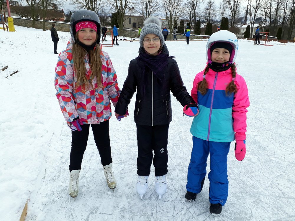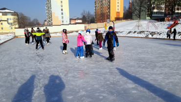 Letošní krásnou zimu využívají čtvrťáci k sáňkování a bruslení na sídlišti.