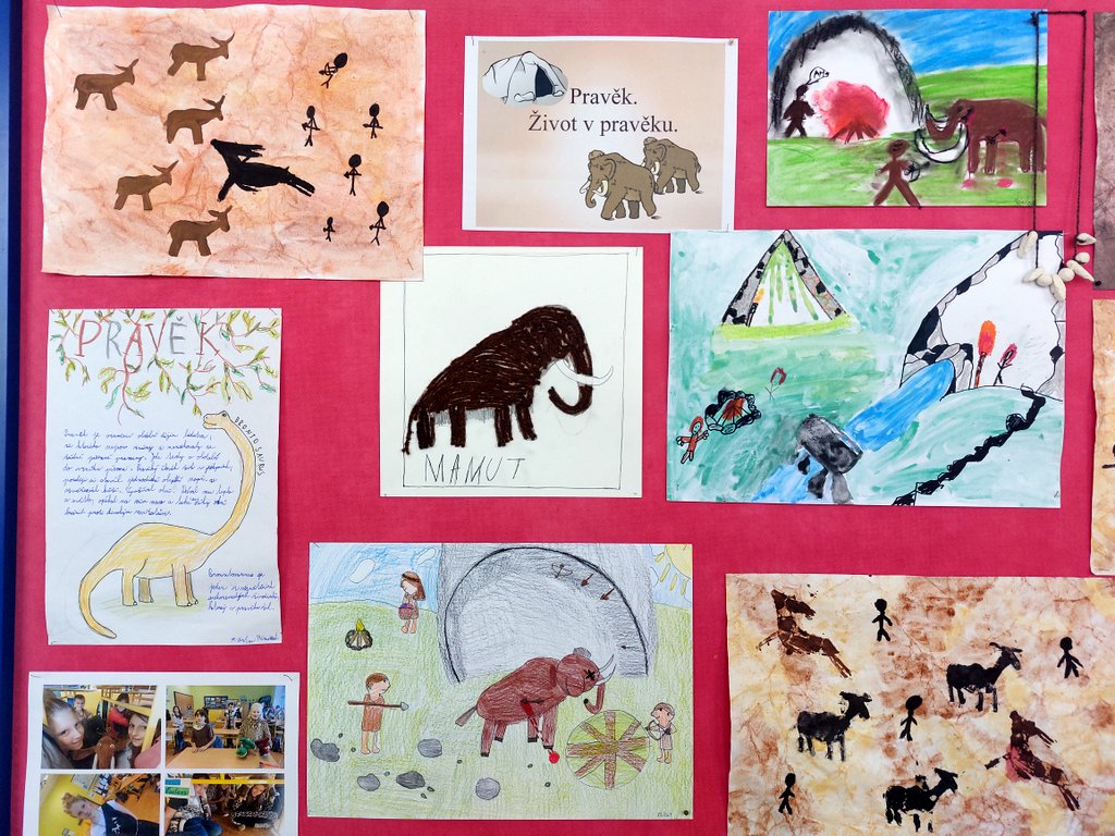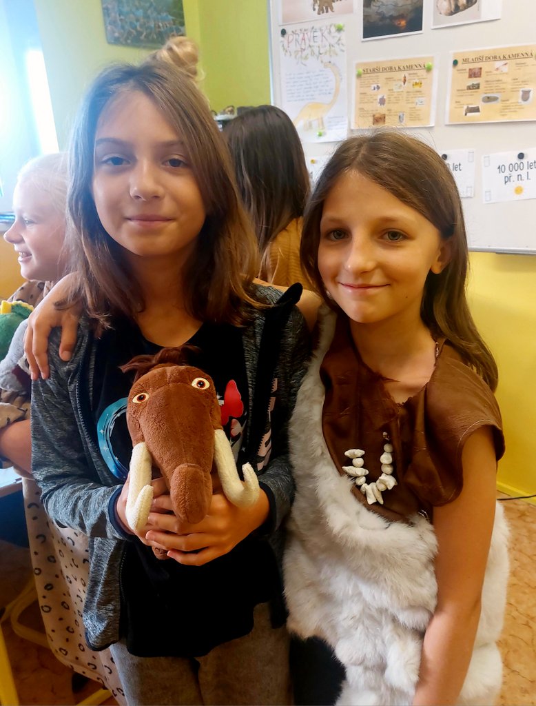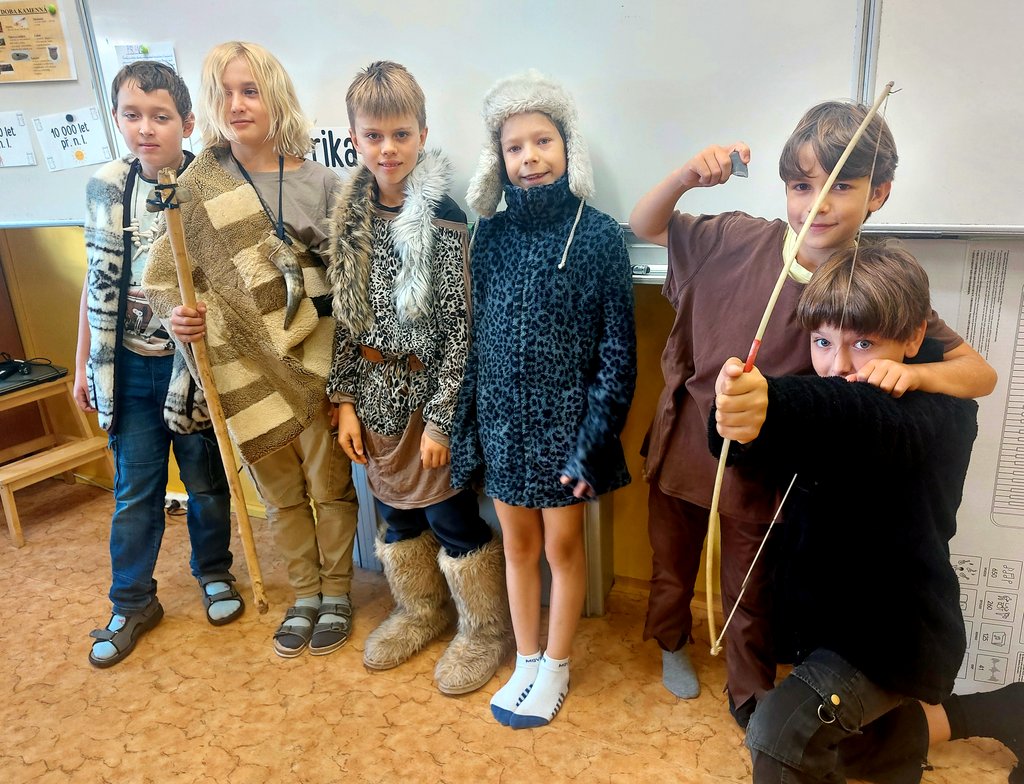 Na jeden den do doby kamenné se přesunuli žáci z 5.A . Již doma si připravili referáty o pravěku a s rodiči vybrali nebo vyrobili vhodné pravěké oblečení. Ve škole se dozdobili vlastnoručně vyrobenými náhrdelníky z hlíny. Zkoušeli se pohybovat, dorozumívat, přesouvat i střílet jako v době kamenné. Vytvořili mamuta z vlny, nástěnné malby a plnili matematické i češtinářské úkoly. Poděkování patří rodičům za pomoc při tvoření kostýmů.
