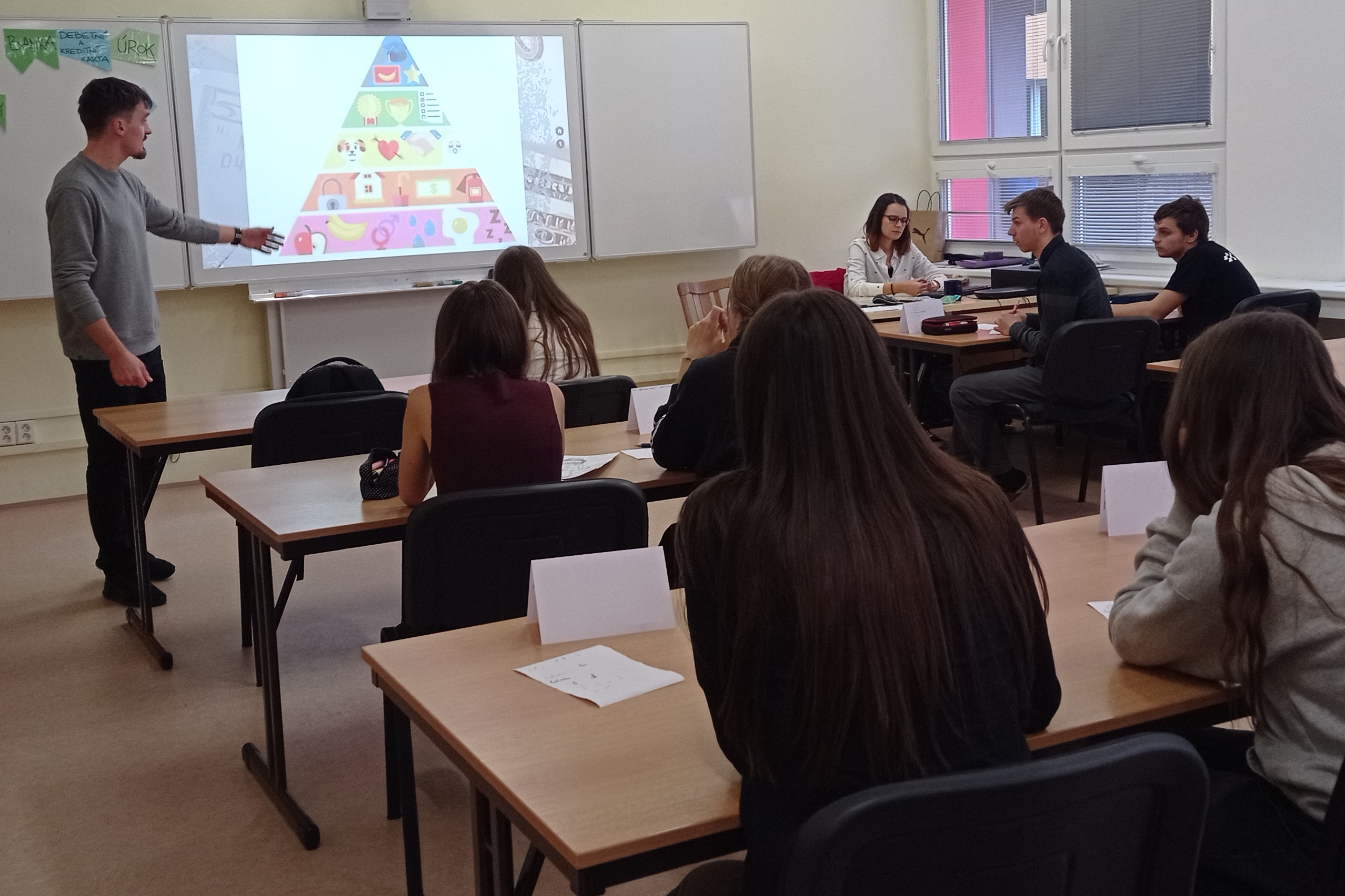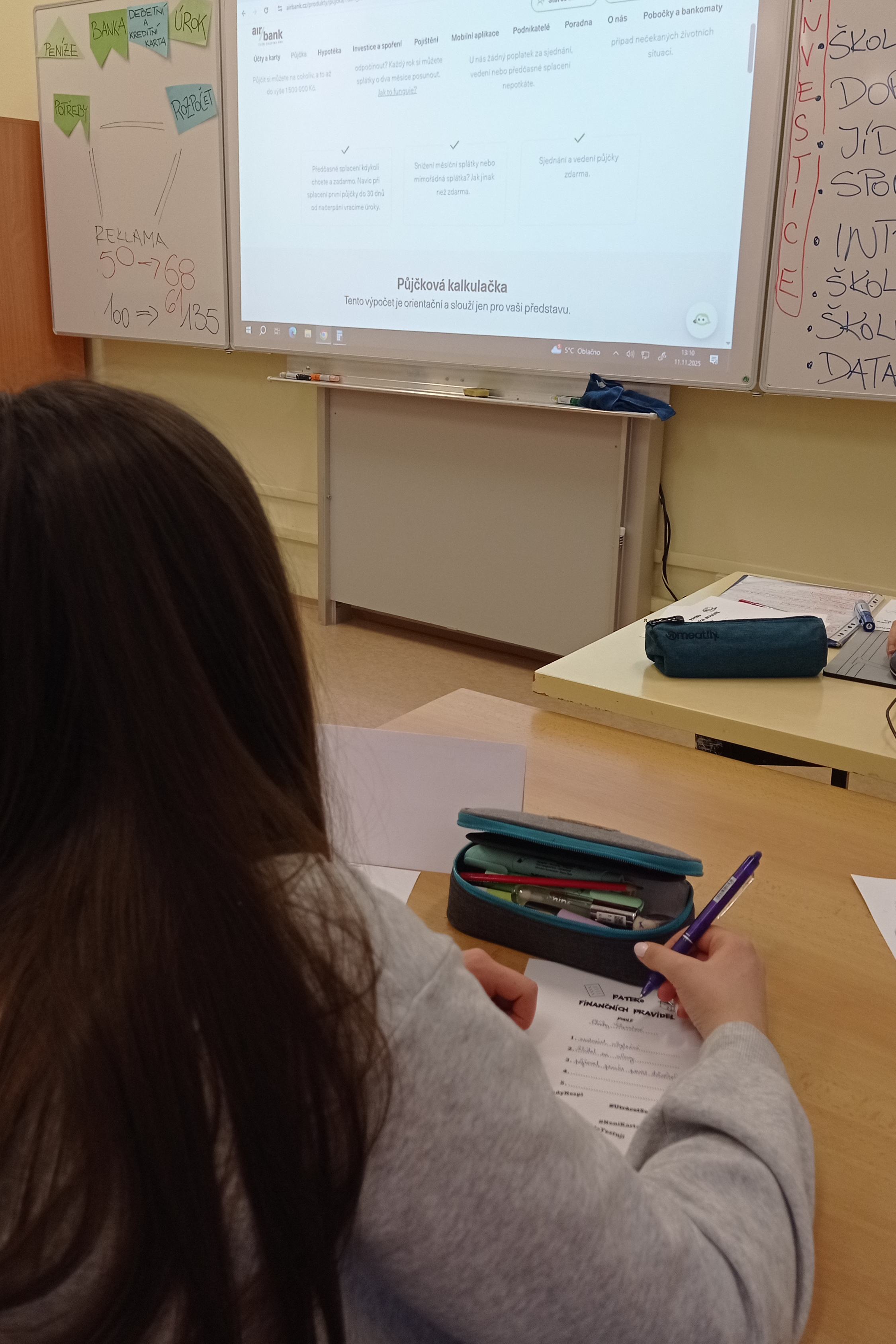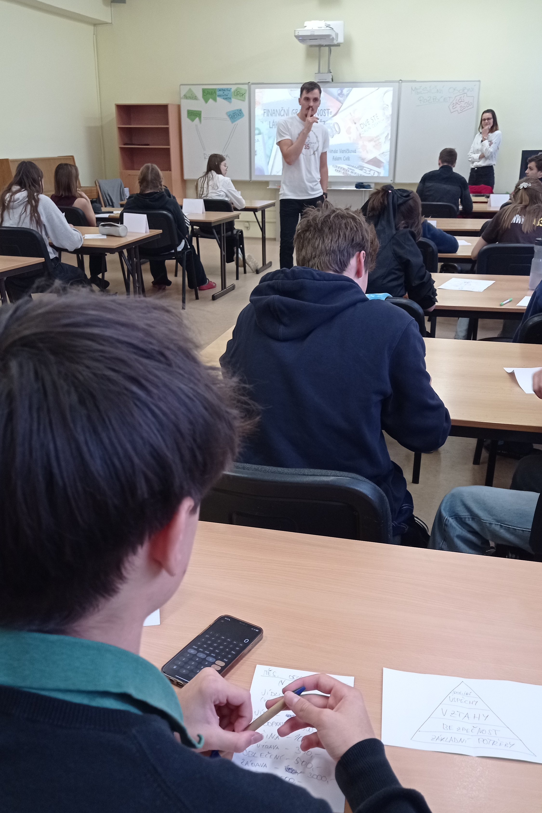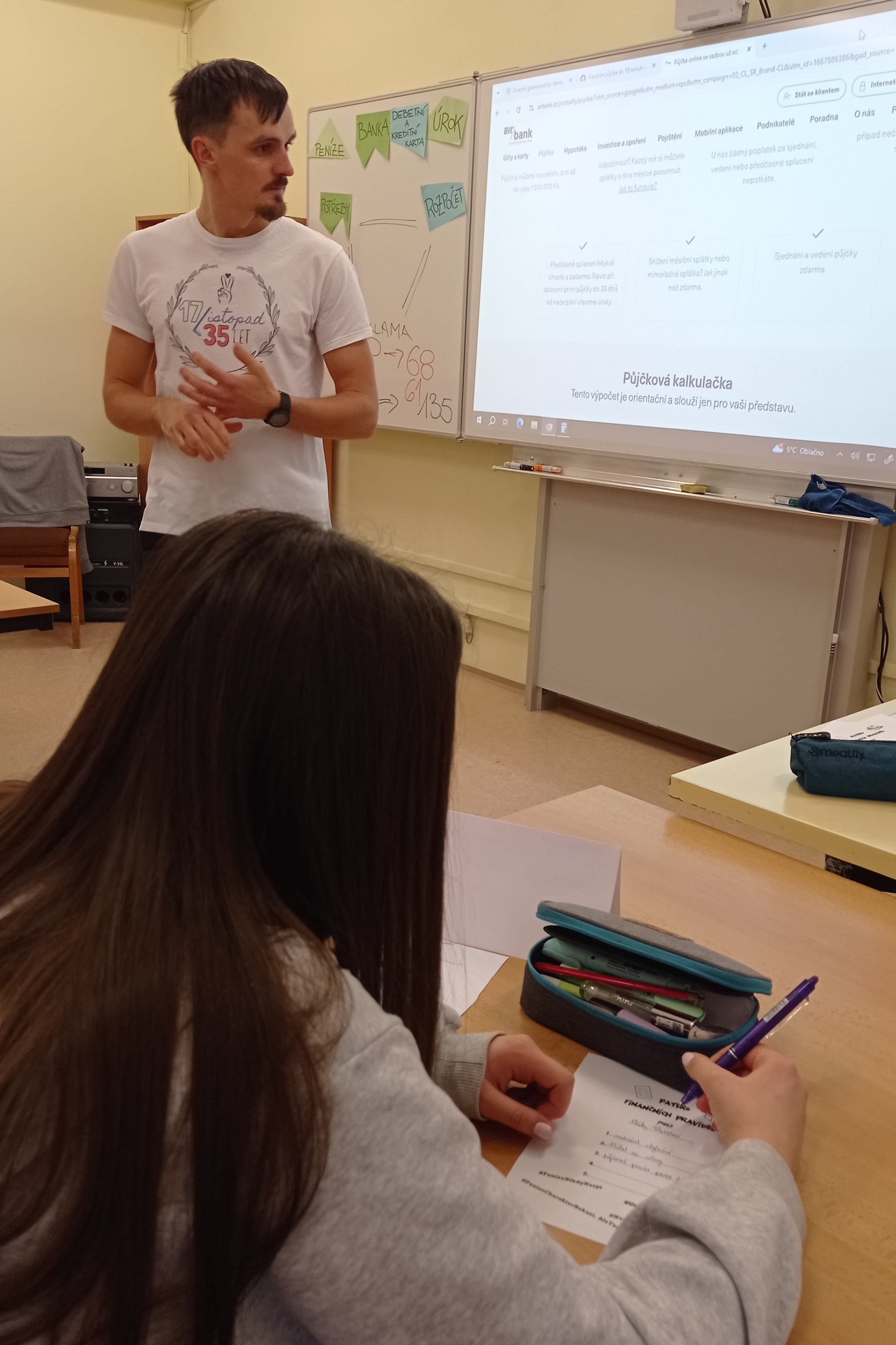 Další část programu byla věnována tématu půjček a zadlužování. Pomocí online kalkulaček a modelových příkladů lektoři žákům ukázali, jak fungují úroky, poplatky a jaké může mít špatně zvolený úvěr následky. Žáci se učili rozpoznávat nevýhodné nabídky a uvědomili si rizika spojená s neuváženým zadlužováním.