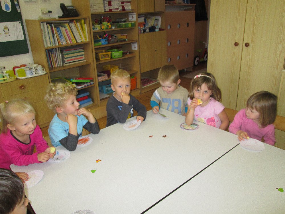 V říjnu si povídáme hlavně o podzimních plodech. Jeden týden jsme se věnovali jablíčkům a jejich zpracováním.