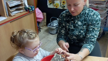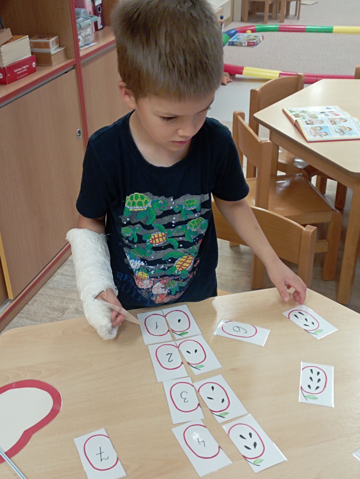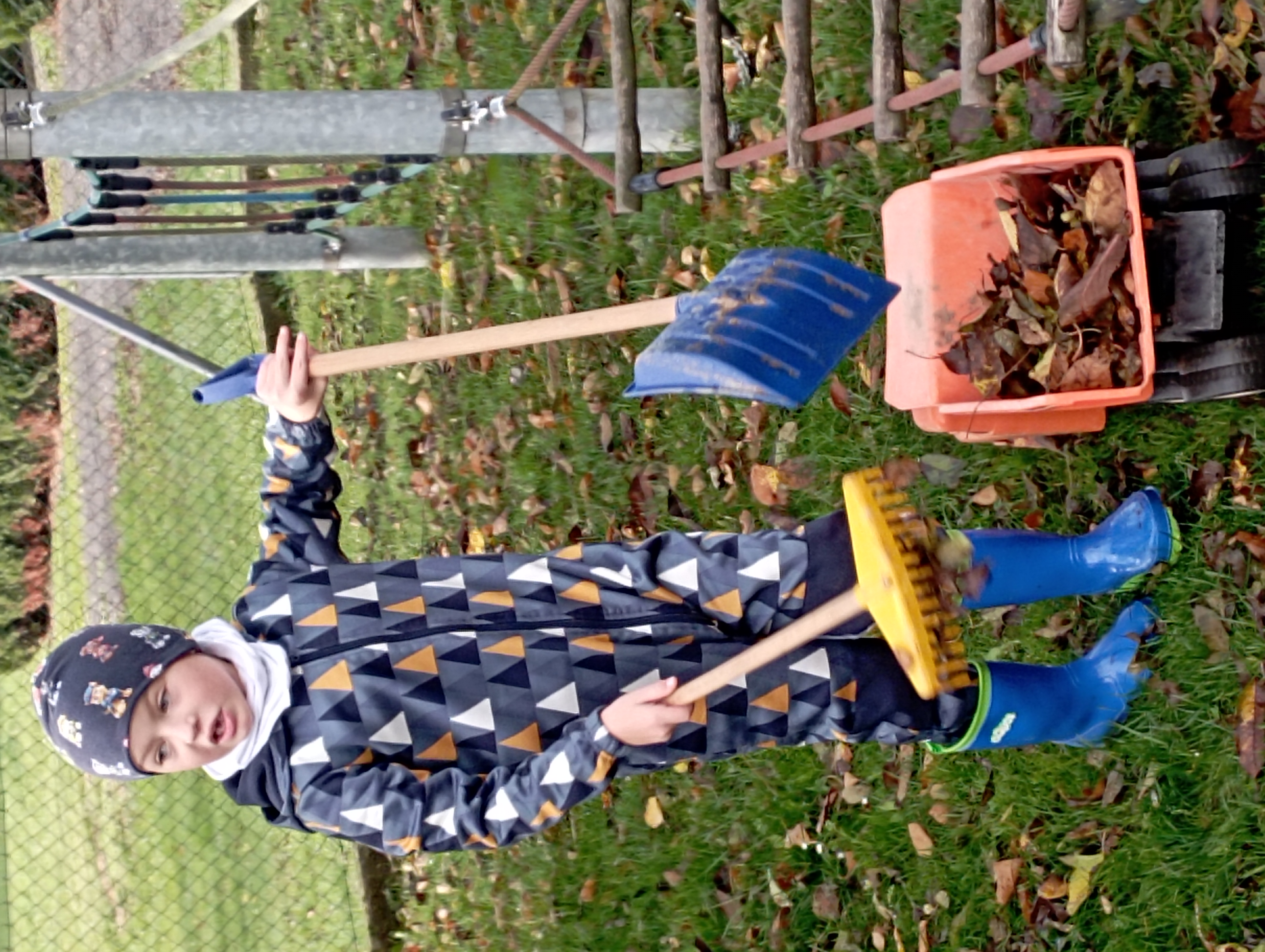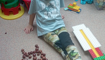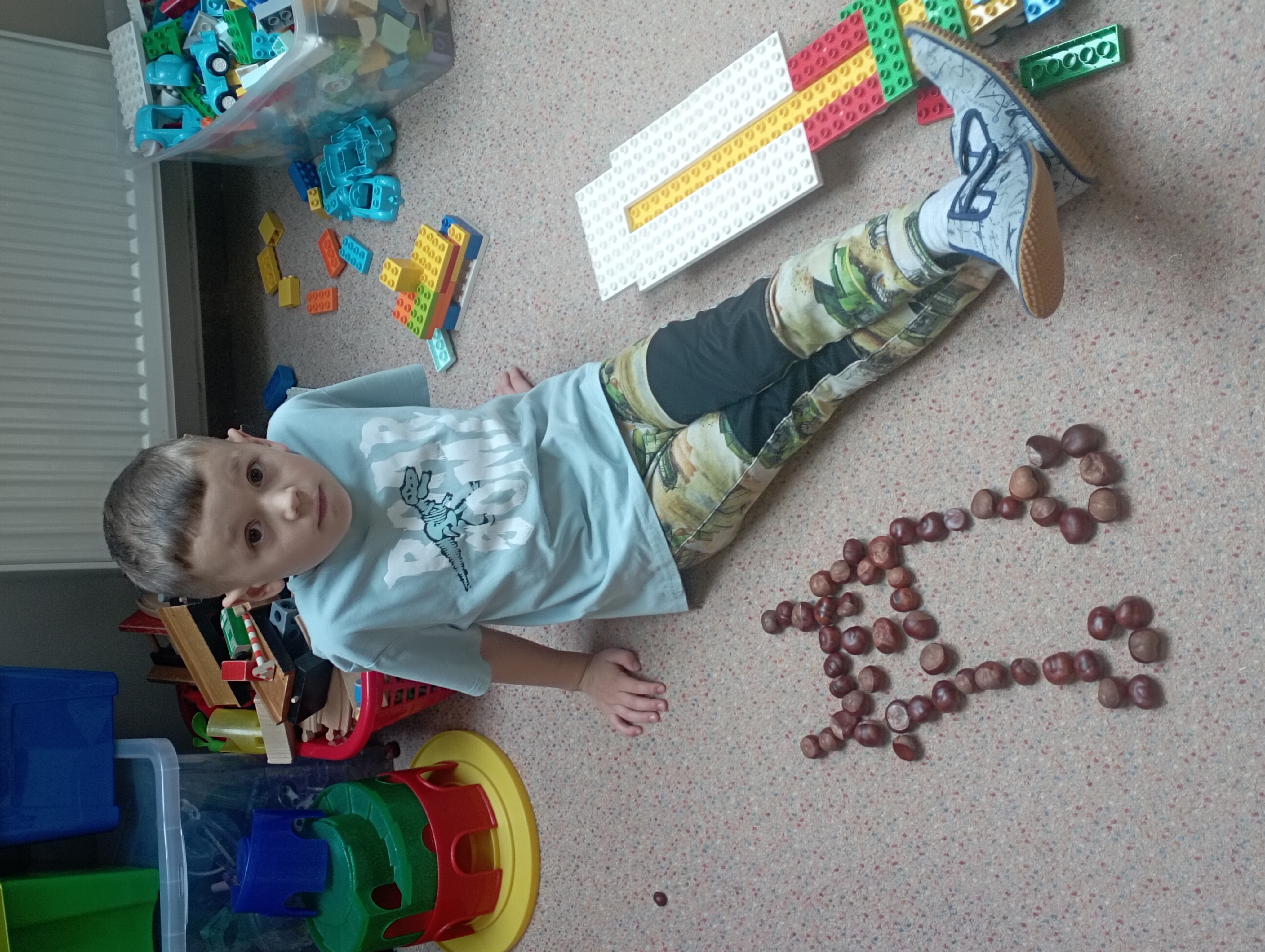 Další dny jsme si pohráli s kaštany – vytvářeli jsme z nich různé obrázky, počítali jsme je, zdobili fixem. Procvičili jsme si na nich i nožní klenbu. Podzimní listí jsme navlékali na nit, naslouchali jsme jejich šustění, některé listy jsme vylisovali v knize, později jsme z nich vytvořili krásné obrázky. Na zahradě jsme shrabovali listí a odváželi ho na hromadu.