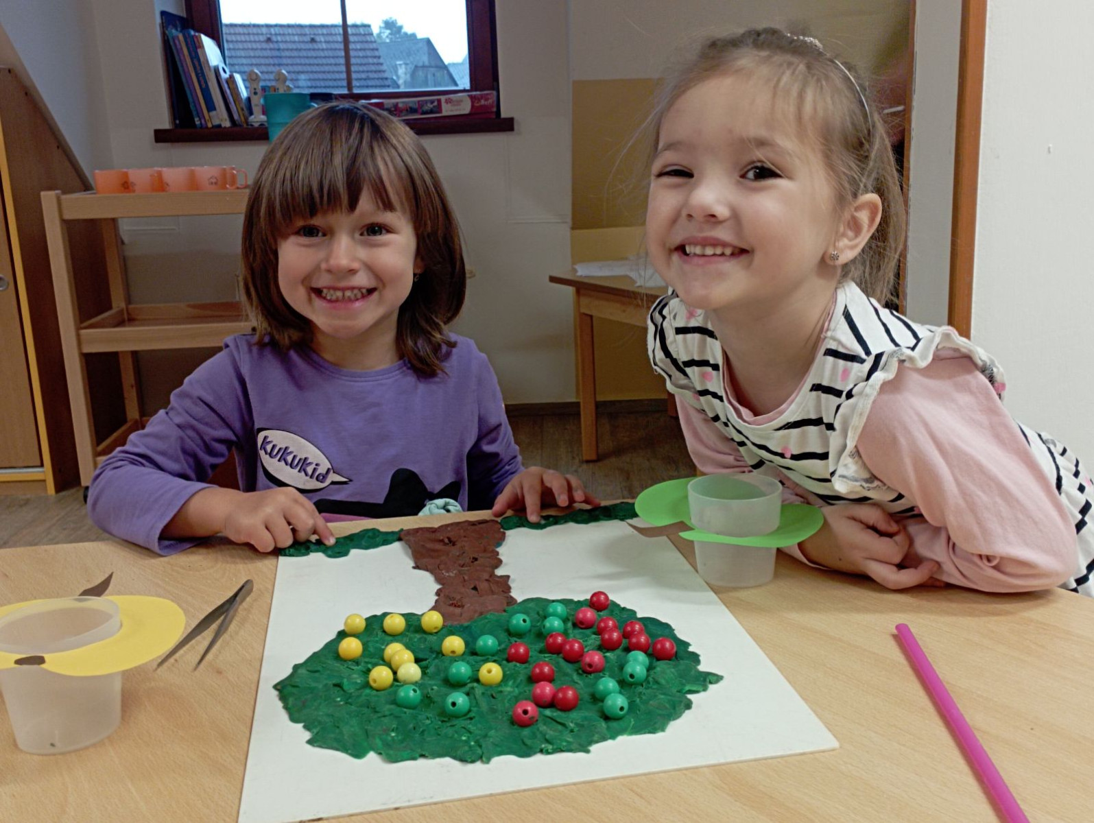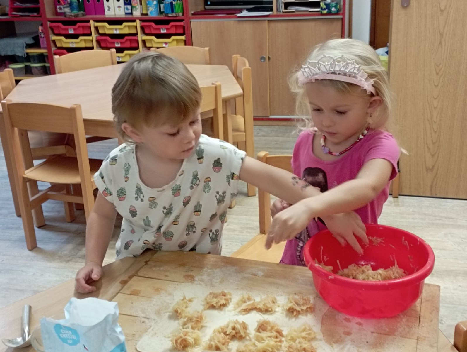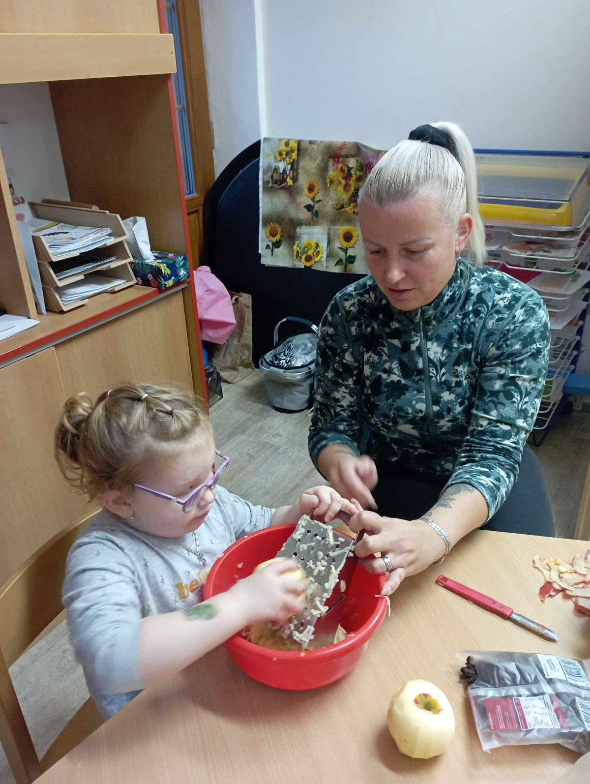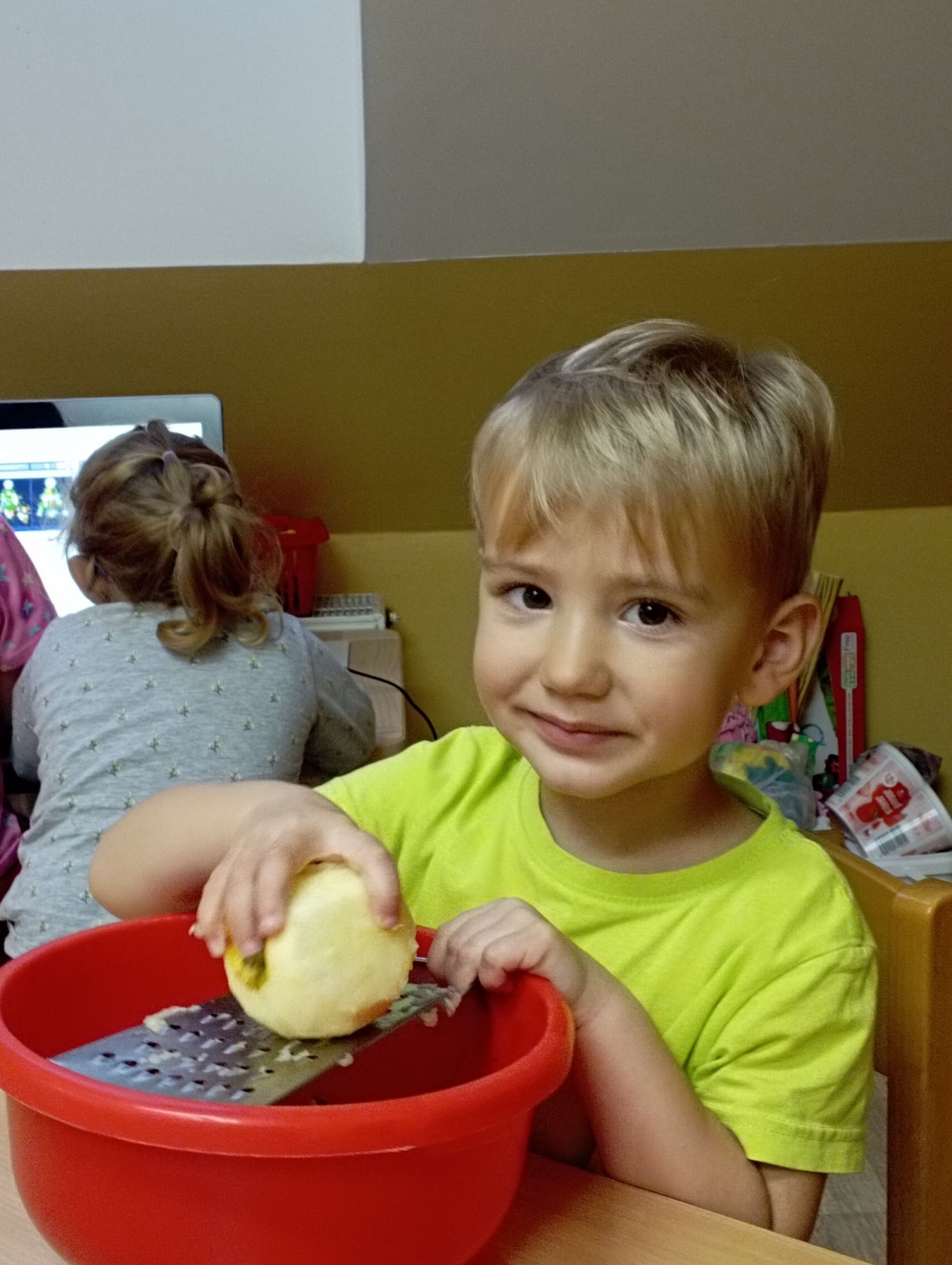 Do školky děti přinášely různé druhy ovoce a zeleniny – učili jsme se je nejenom pojmenovat, ale sledovali jsme i jejich chuť a vůni. Děti se zapojily do pečení štrúdlu – loupaly jablíčka a strouhaly je, válely těsto, přidávaly další přísady. Zanedlouho byla cítit po školce líbezná vůně, a pak ta dobrota, hmm!