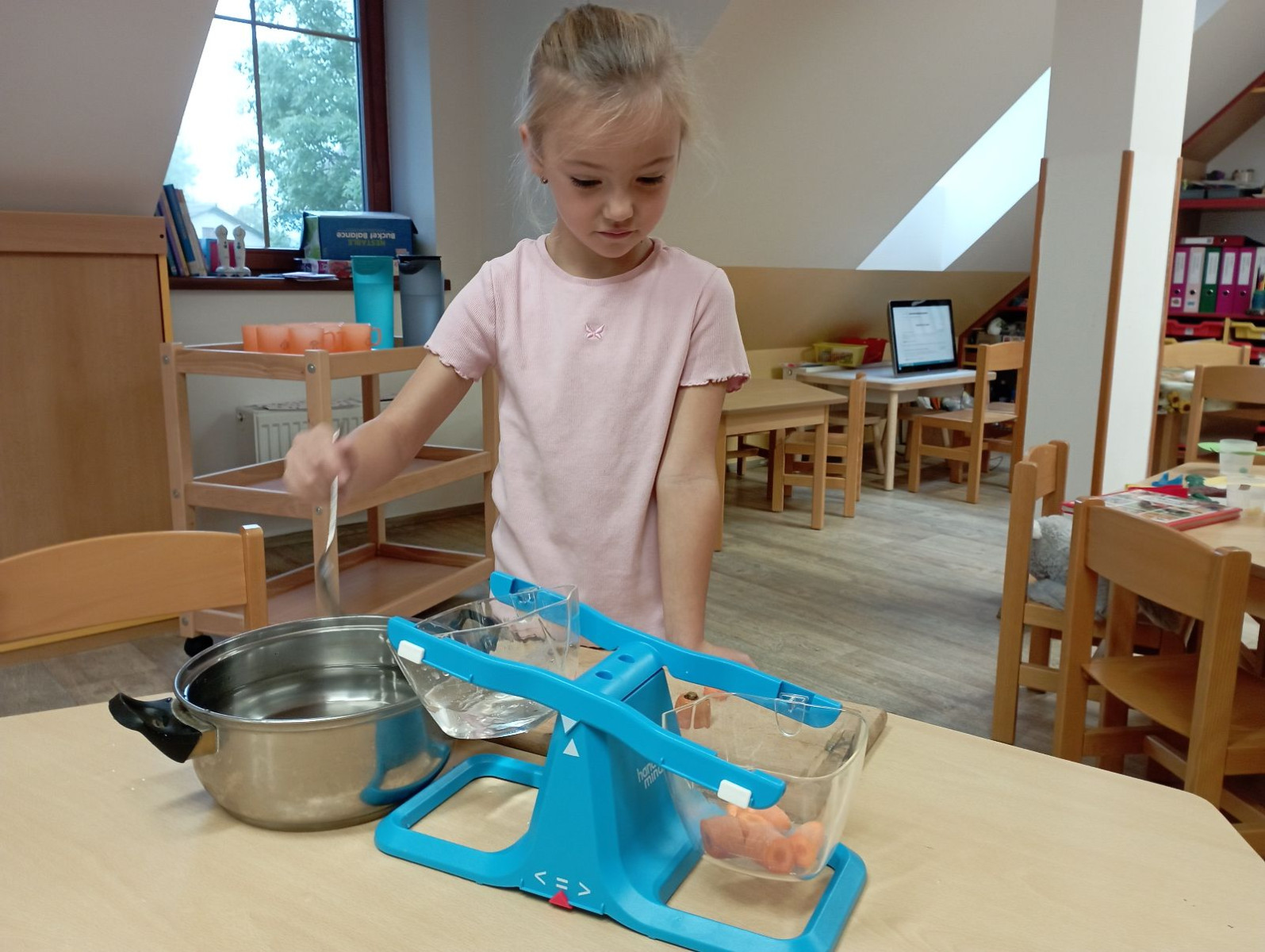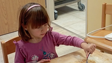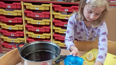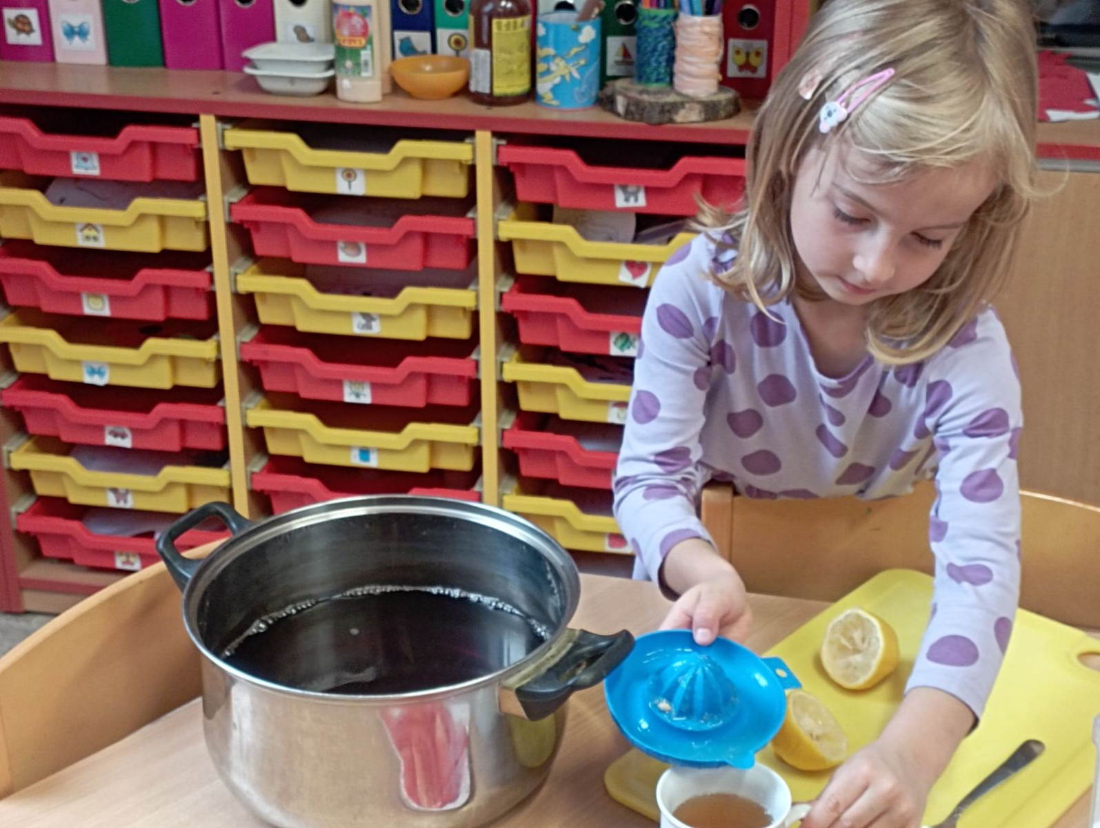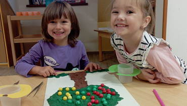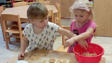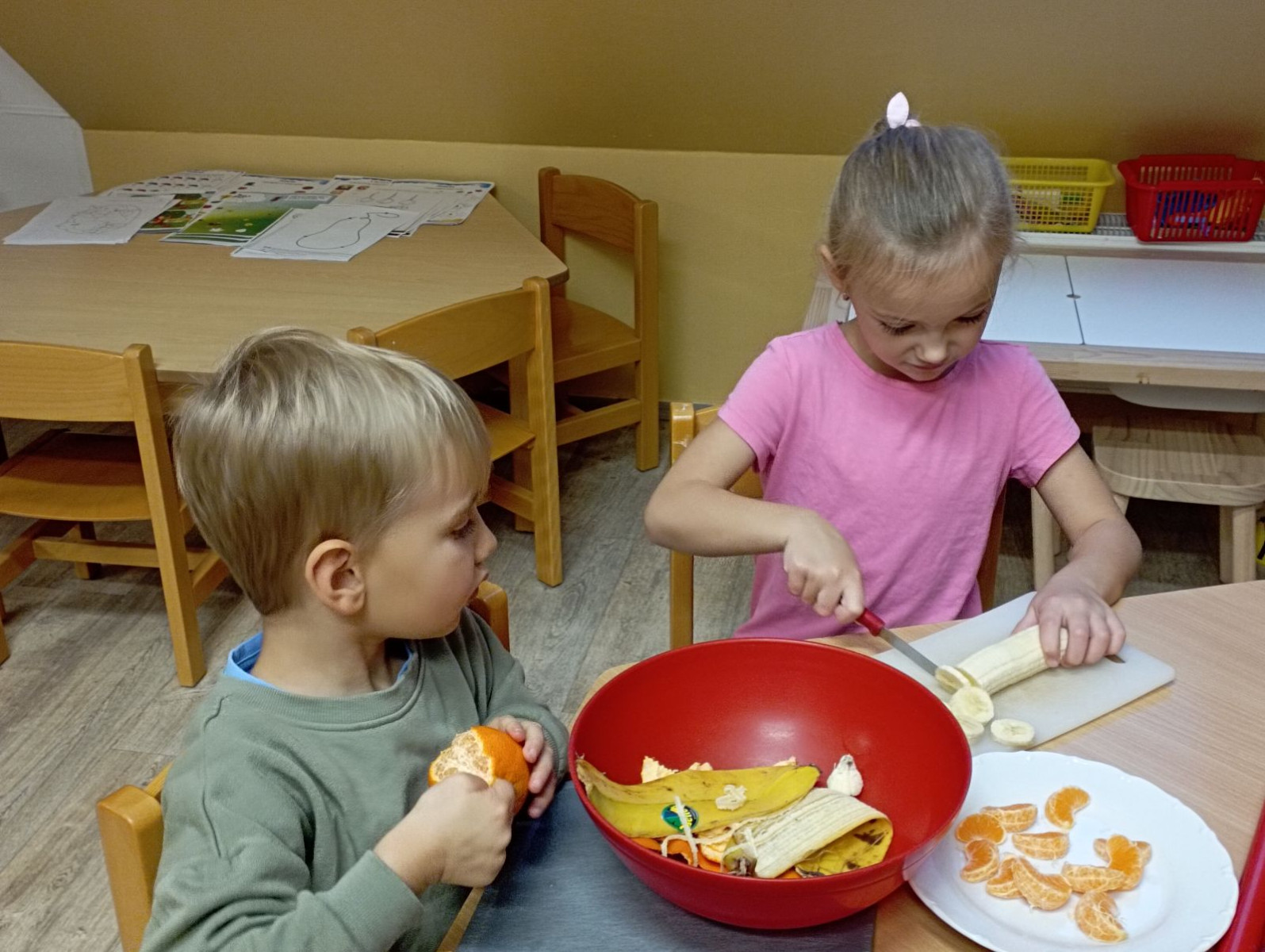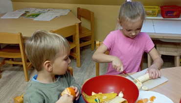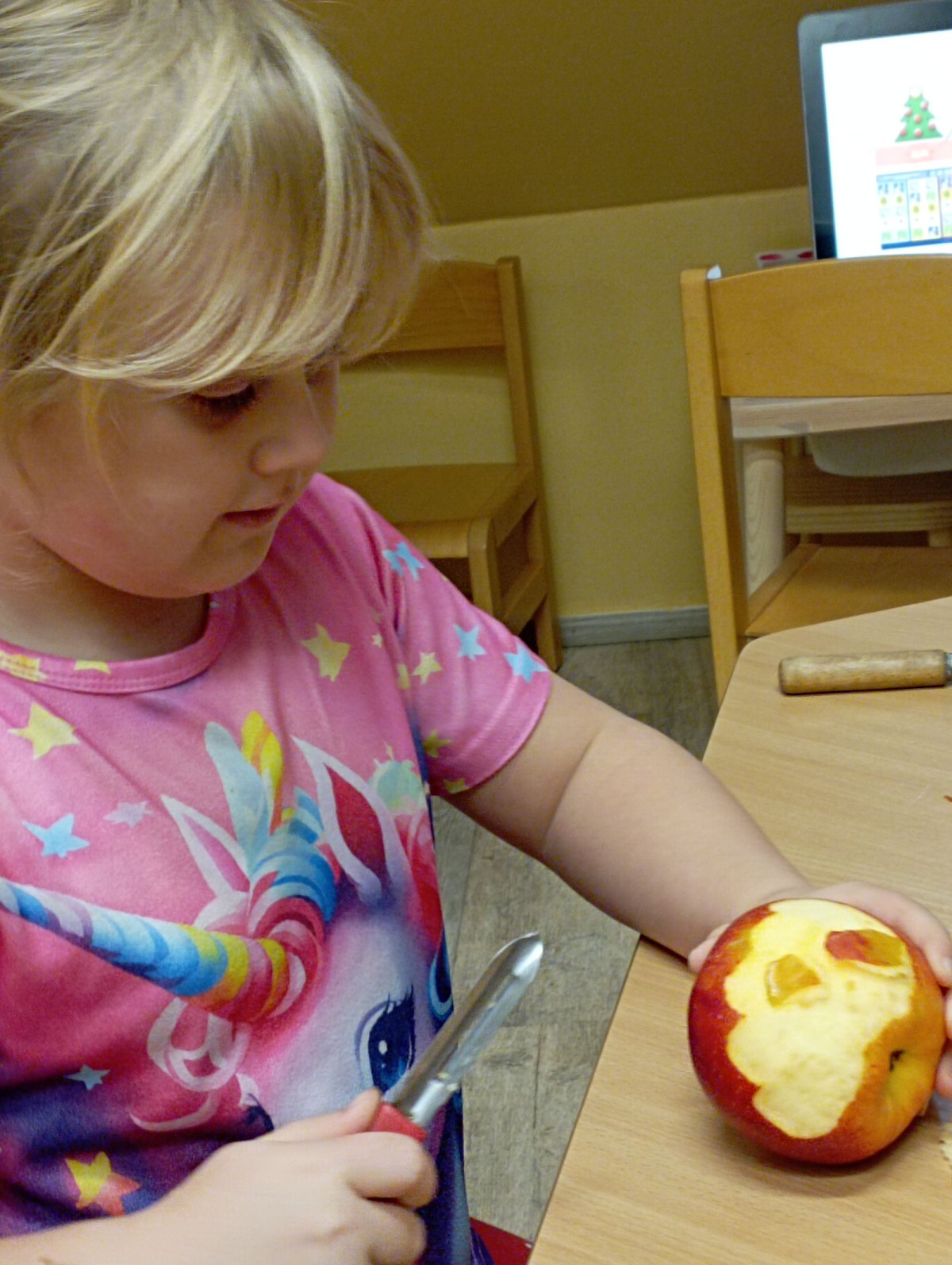 Do školky děti přinášely různé druhy ovoce a zeleniny – učili jsme se je nejenom pojmenovat, ale sledovali jsme i jejich chuť a vůni. Děti se zapojily do pečení štrúdlu – loupaly jablíčka a strouhaly je, válely těsto, přidávaly další přísady. Zanedlouho byla cítit po školce líbezná vůně, a pak ta dobrota, hmm!