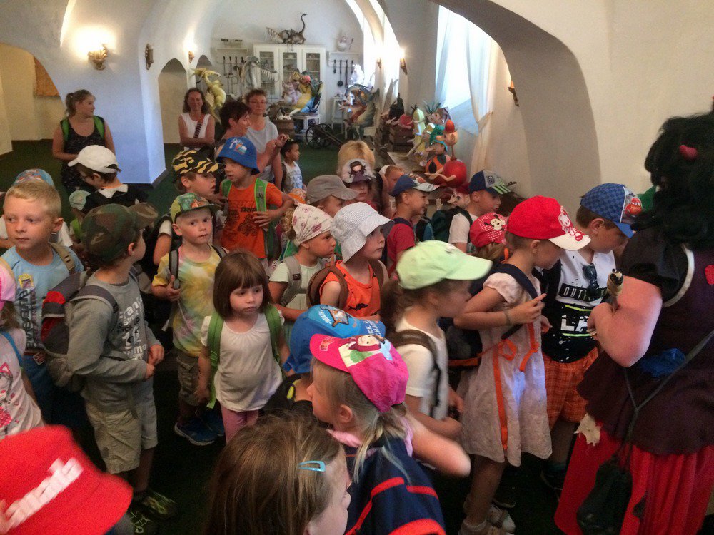Na zámku nás čekaly dva prohlídkové okruhy: Zdravosvět a Dračí království a Zámecké pohádkové sklepení. První cesta nás zavedla do světa zdraví mezi skřítky ovocňáky a saláťáky, do dračí porodnice a zuboopravny, za vílou Vitamínou a skřítky baciláky, do zdravoškoly a do dračího světa. V pohádkovém sklepení jsme se ocitli v lesním a ledovém království, u rodinky obra, u vodníků, u draka, v paláci plném skřítků a v čertovské domácnosti. Během přestávky jsme se stihli nasvačit a ještě si projít čarodějnou Bestyjolu plnou živých zvířátek.