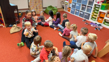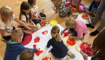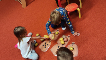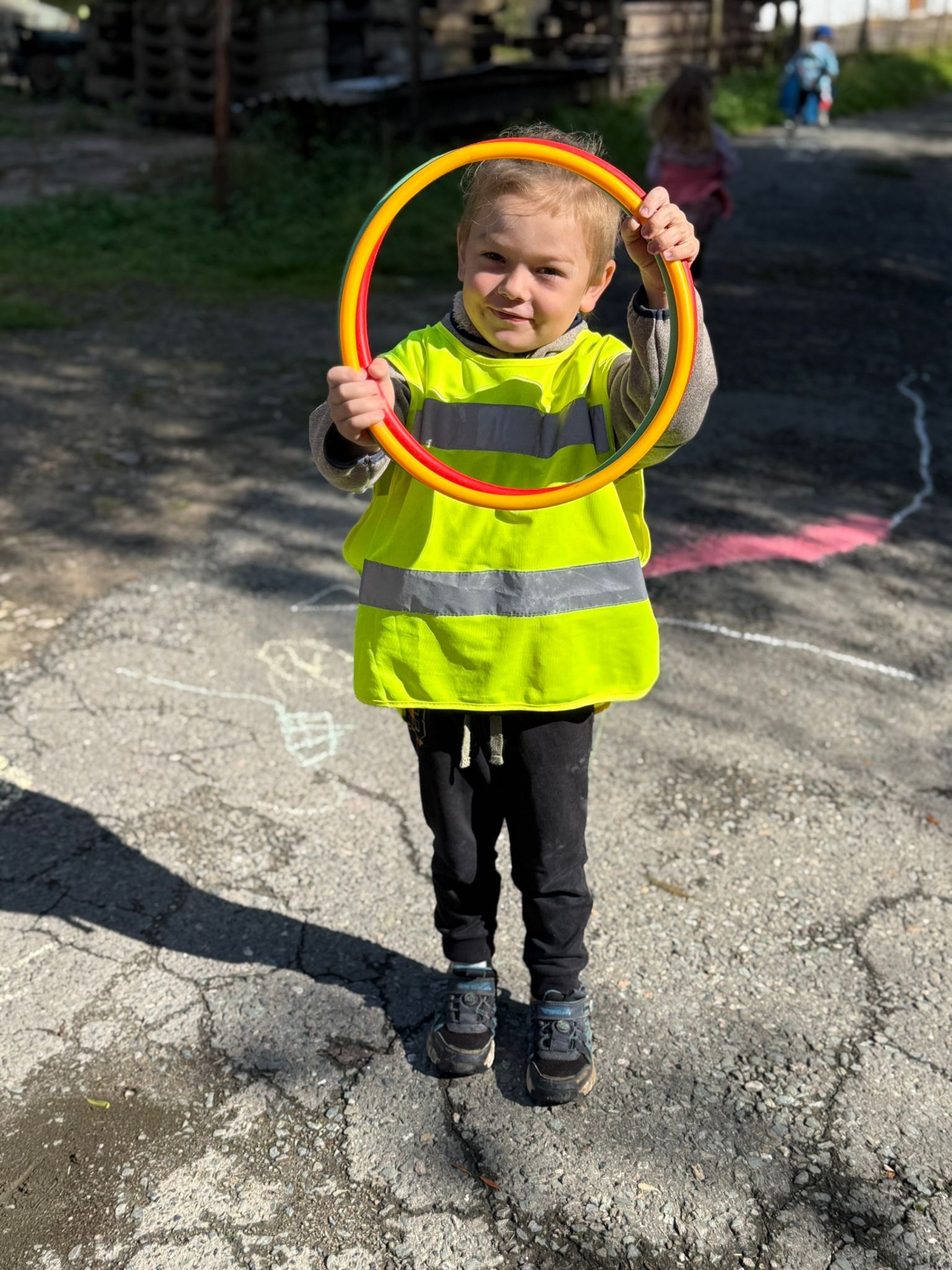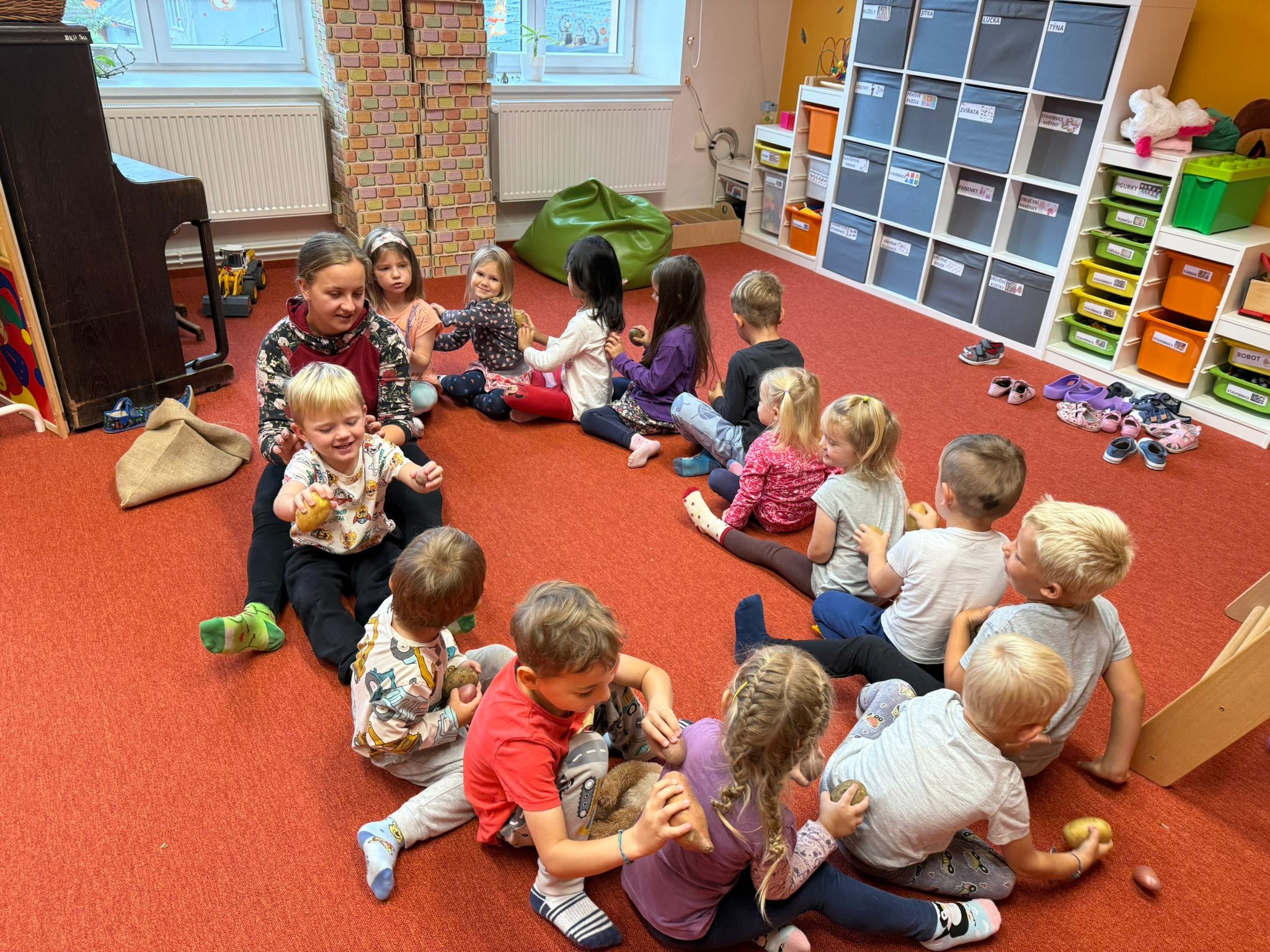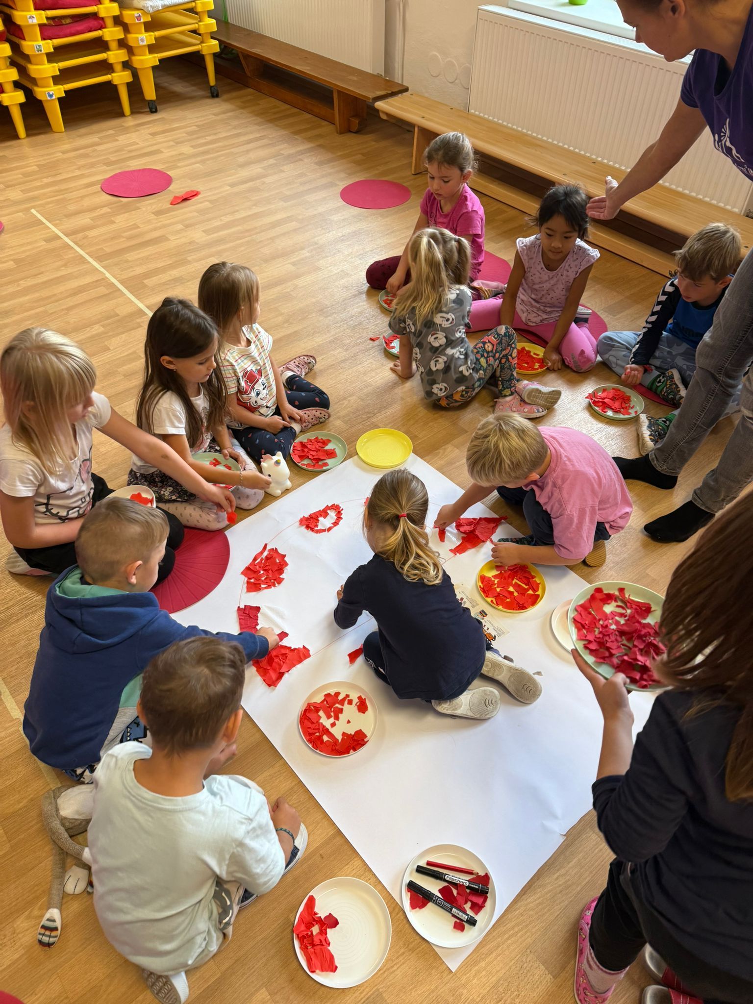 Na začátku jsme se věnovali tématu „Režim dne, emoce a chování“ – učili jsme se, jak to ve školce chodí, jak rozpoznat různé pocity a jak se k sobě hezky chovat. Vytvořili jsme velké srdíčko s otisky ručiček, usměvavé smajlíky a zahráli si hru Pavučina přátelství. Navštívili jsme také podzimní výstavu v Pellyho domech.