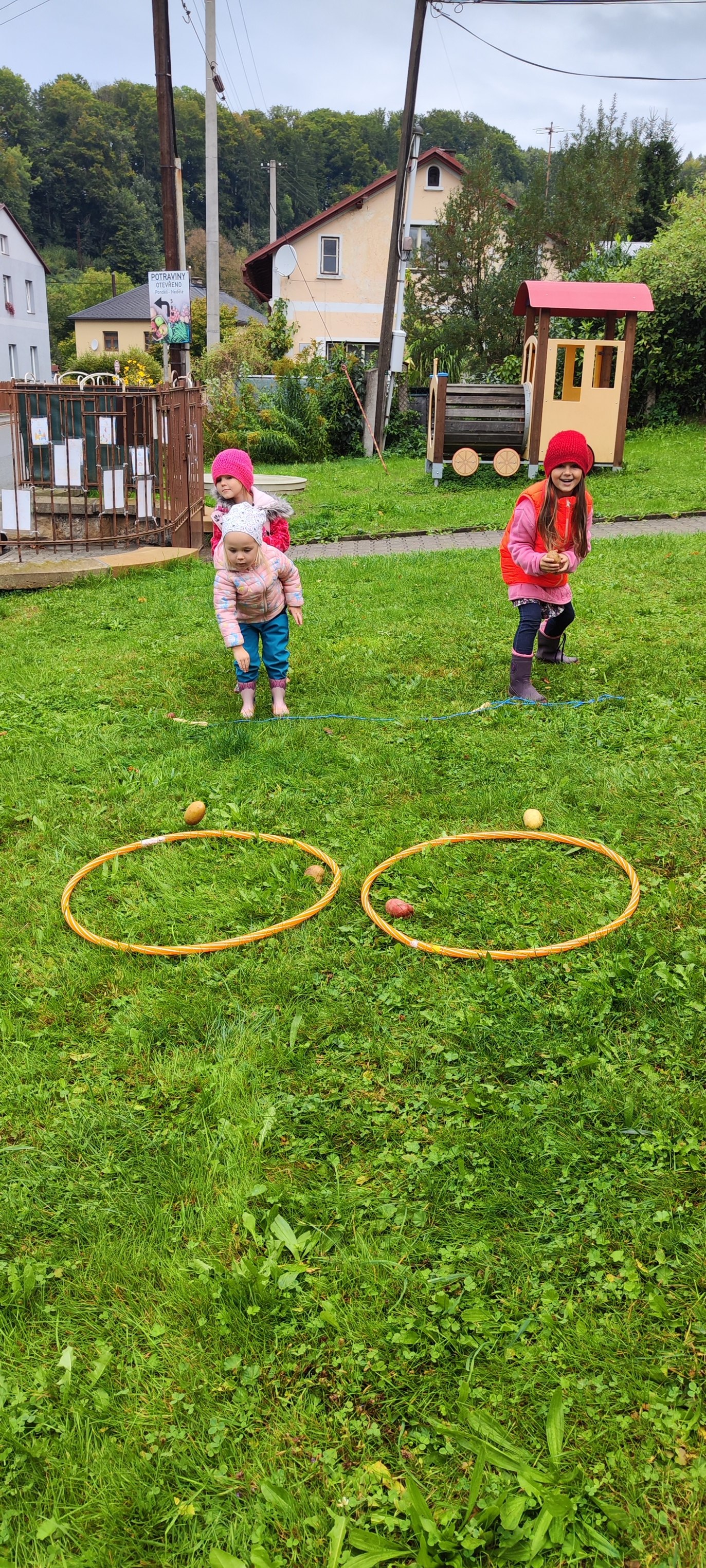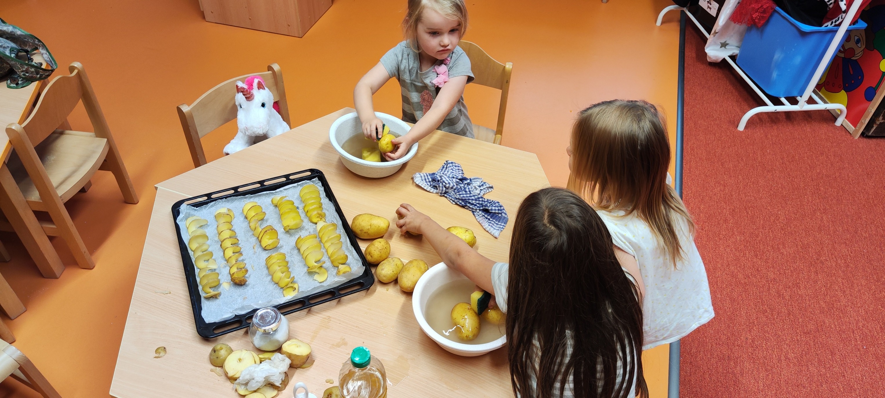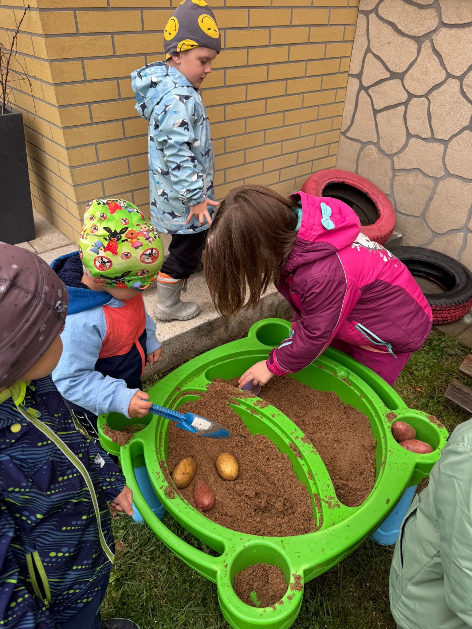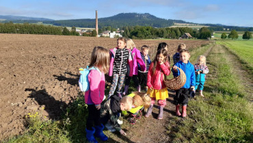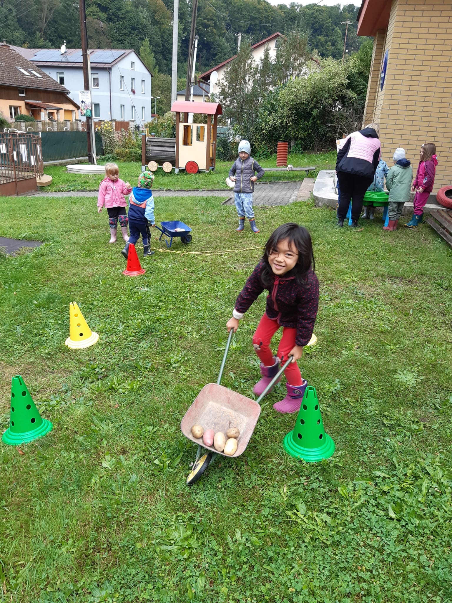 Na závěr měsíce jsme si povídali o tom, co roste na poli i na zahradě. Poznávali jsme plodiny, tvořili traktory, kukuřici i pytle brambor. Společně jsme si připravili bramborové spirálky a na zahradě si užili Bramboriádu plnou zábavy.