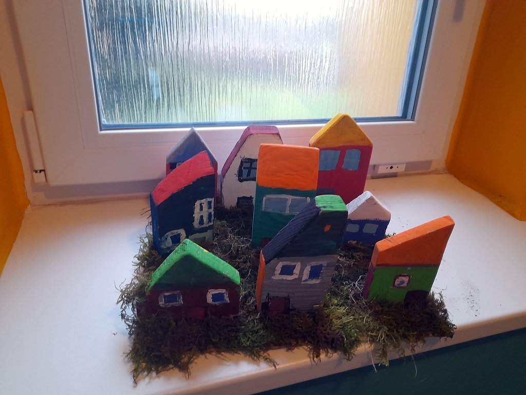 Vyrobili jsme si divadélko a barevné vesničky, kterými jsme vyzdobili okna na prvním stupni.