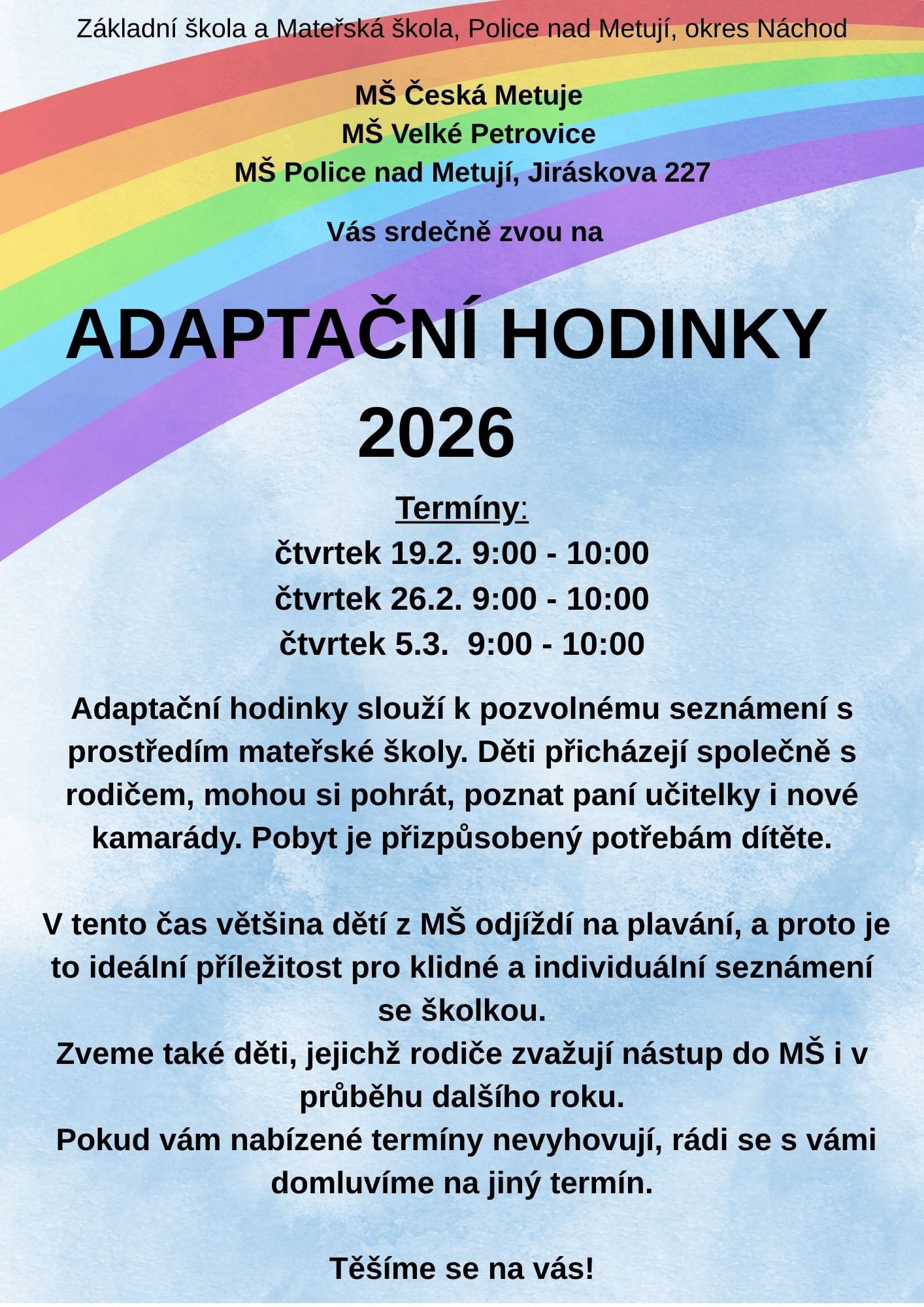 Srdečně zveme na adaptační hodinky do našich MŠ.