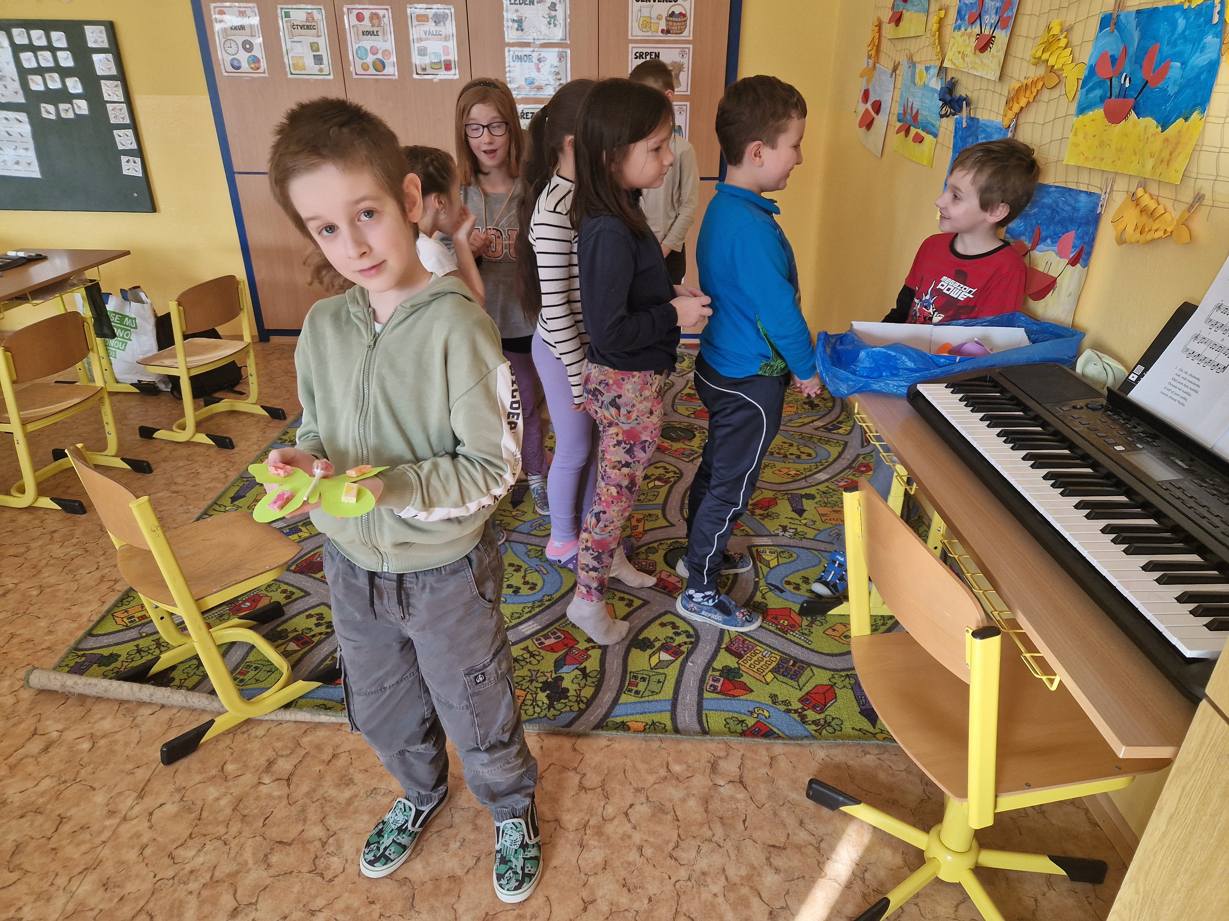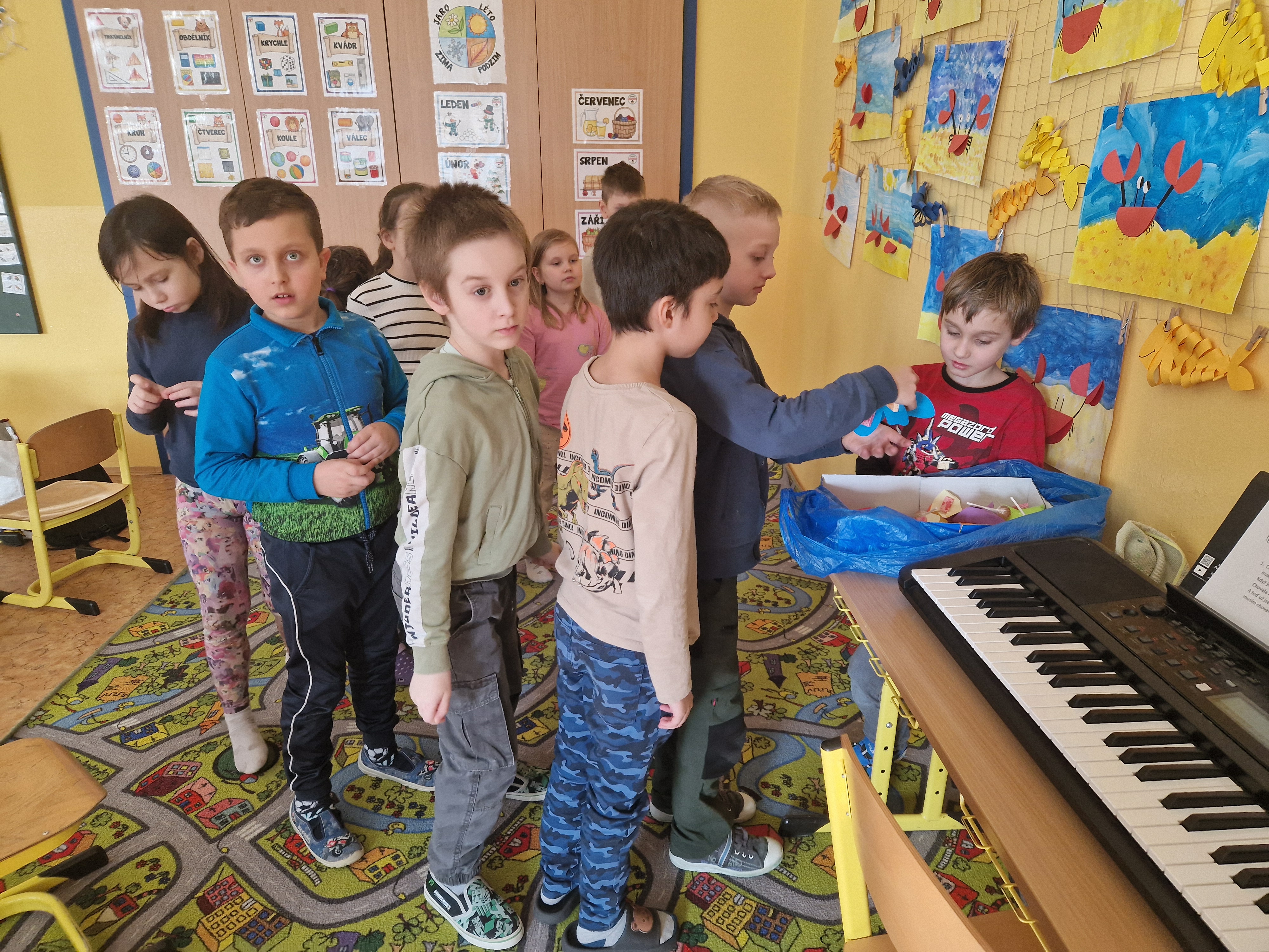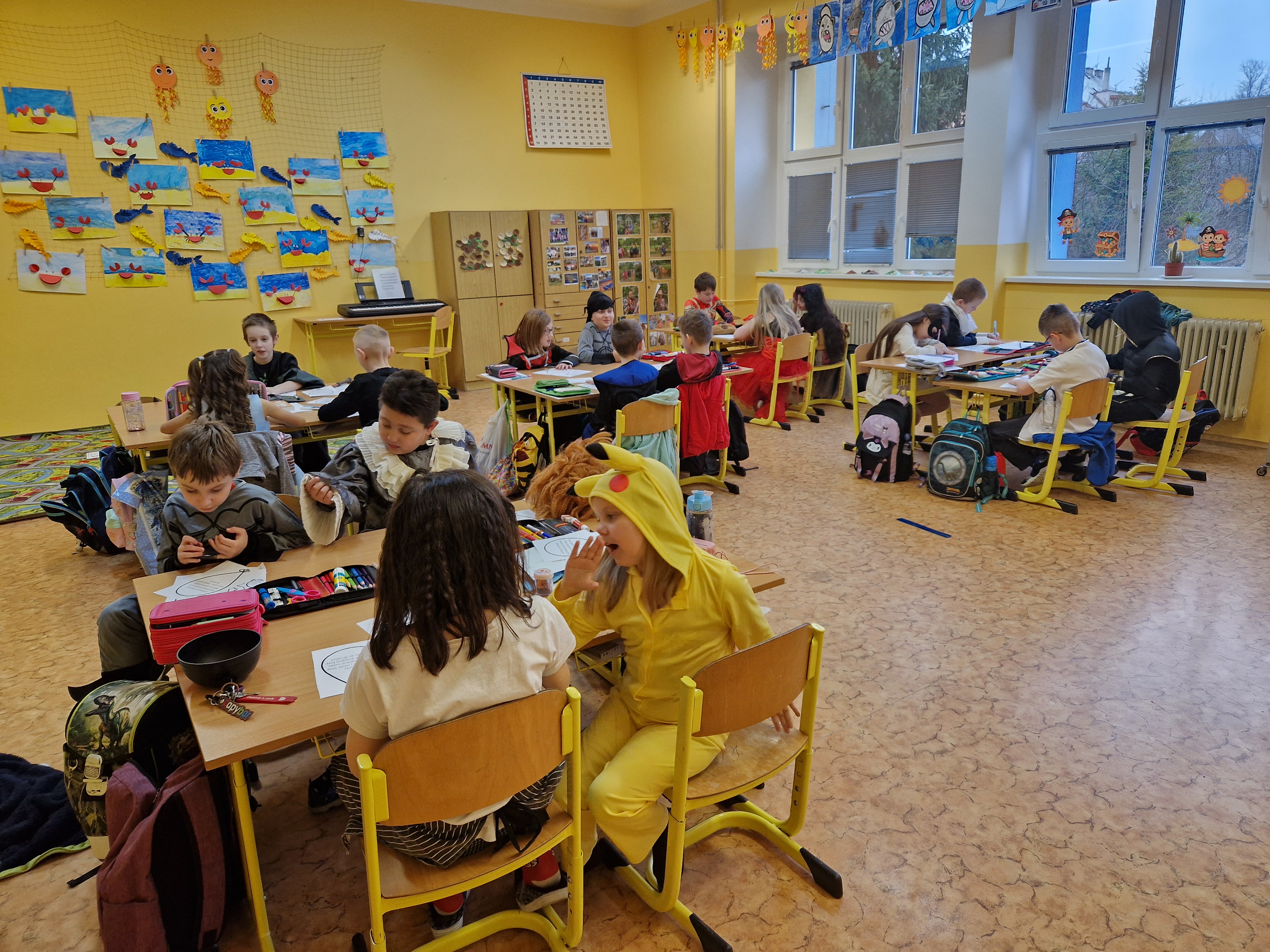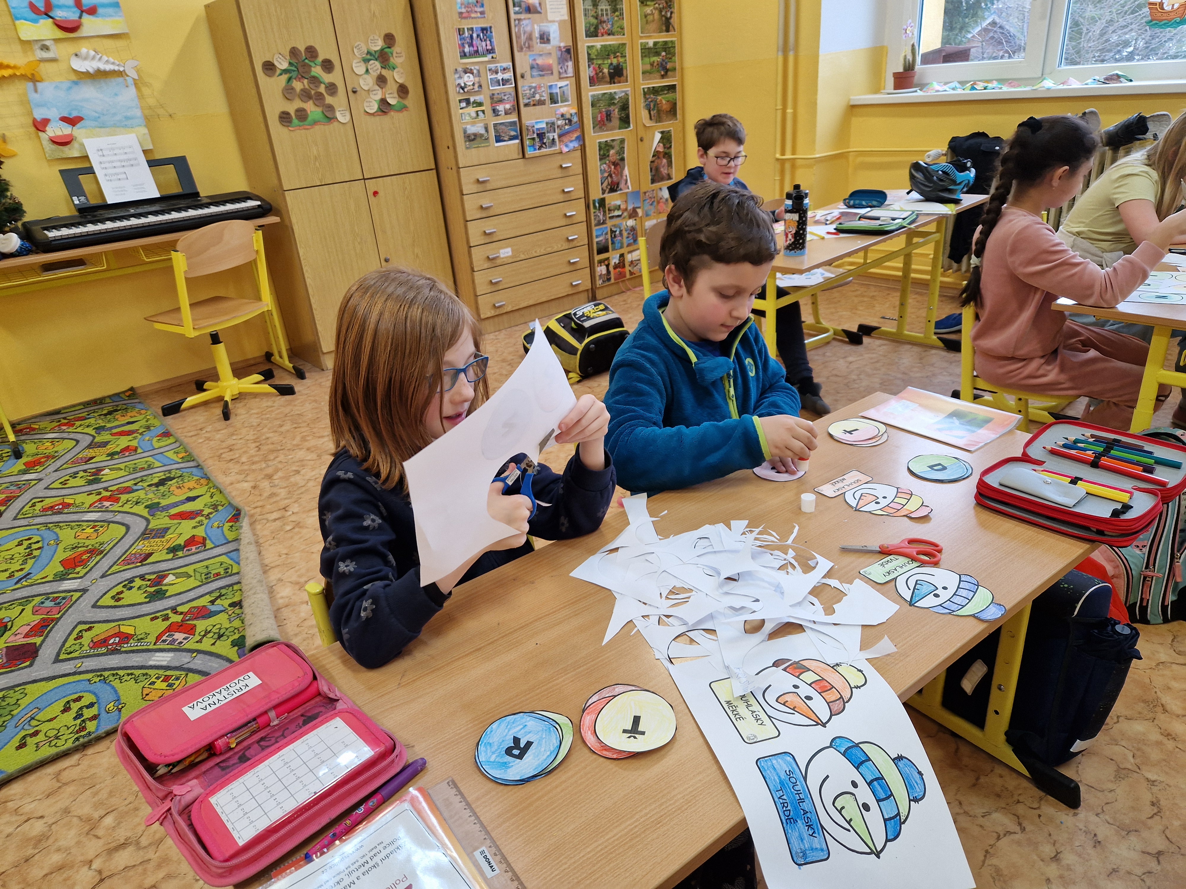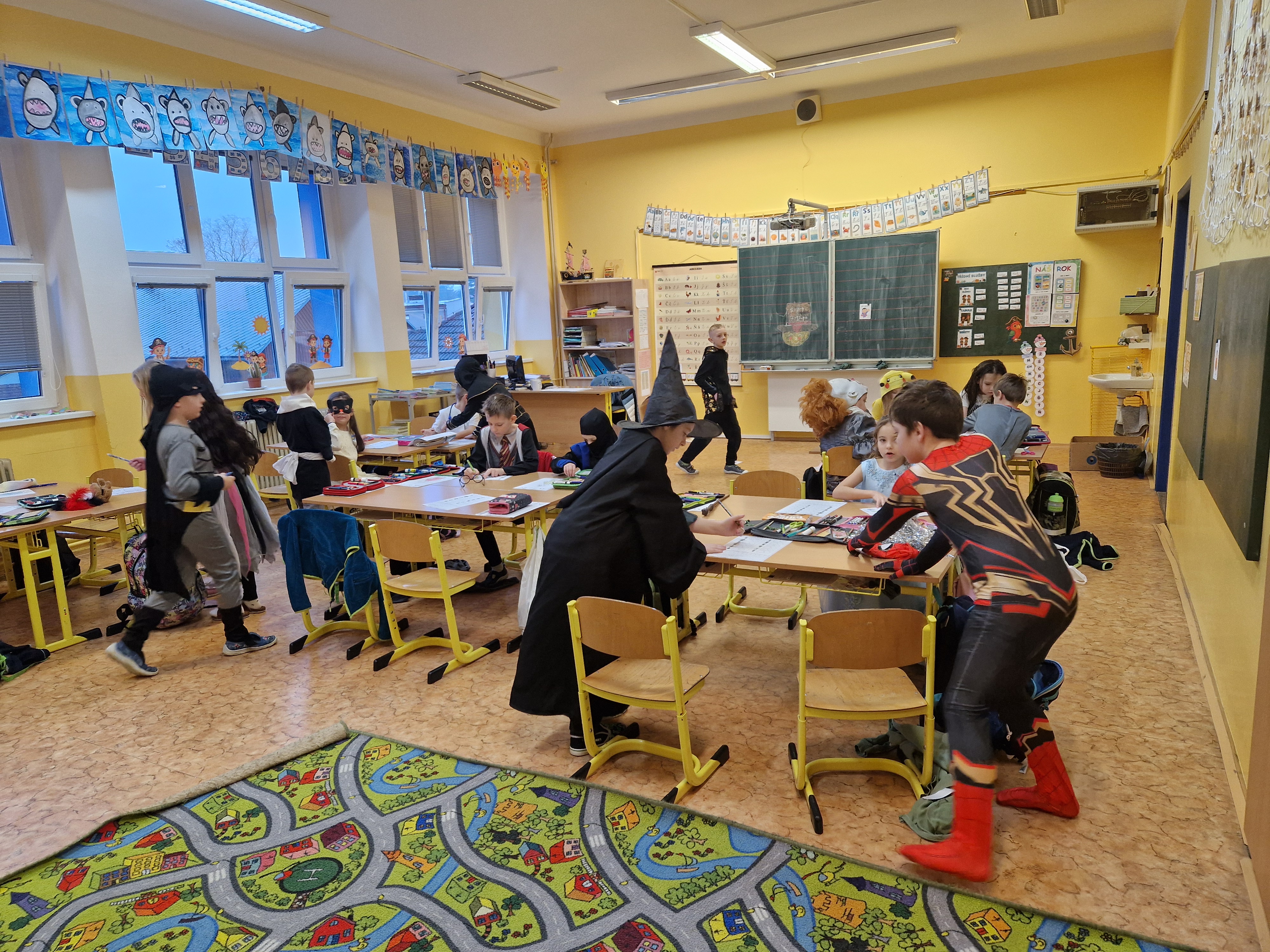 V lednu jsme s dětmi navštívili Dřevěnku a seznámili se s životem našich předků. Využili jsme také lednové mrazivé počasí a několikrát jsme si zabruslili na sídlišti. Před školou jsme stavěli sněhuláky a pak jsme je také v češtině vyrobili z papíru a procvičili tvrdé a měkké souhlásky. Únor je měsíc karnevalů a i my jsme si ho společně s 2.A a 2.C zorganizovali a pořádně užili. Děkuji rodičům za přípravu nádherných masek. A když už jsme měli pro letošek sehnané brusle, využili jsem je i dvakrát v únoru na umělé ledové ploše na víceúčelovém hřišti. V matematice jsme v tu dobu teoreticky nakupovali školní potřeby a na víceúčelovém hřišti jsme si v praxi nakoupili drobnosti pro naše mlsné jazýčky. Tahle praktická činnost baví vždy děti nejvíce :-) Ve třídě slavíme během roku také svátky a narozeniny. Rodiče nám často připraví krásné dárečky. Děkujeme, vždy to všechny moc potěší!