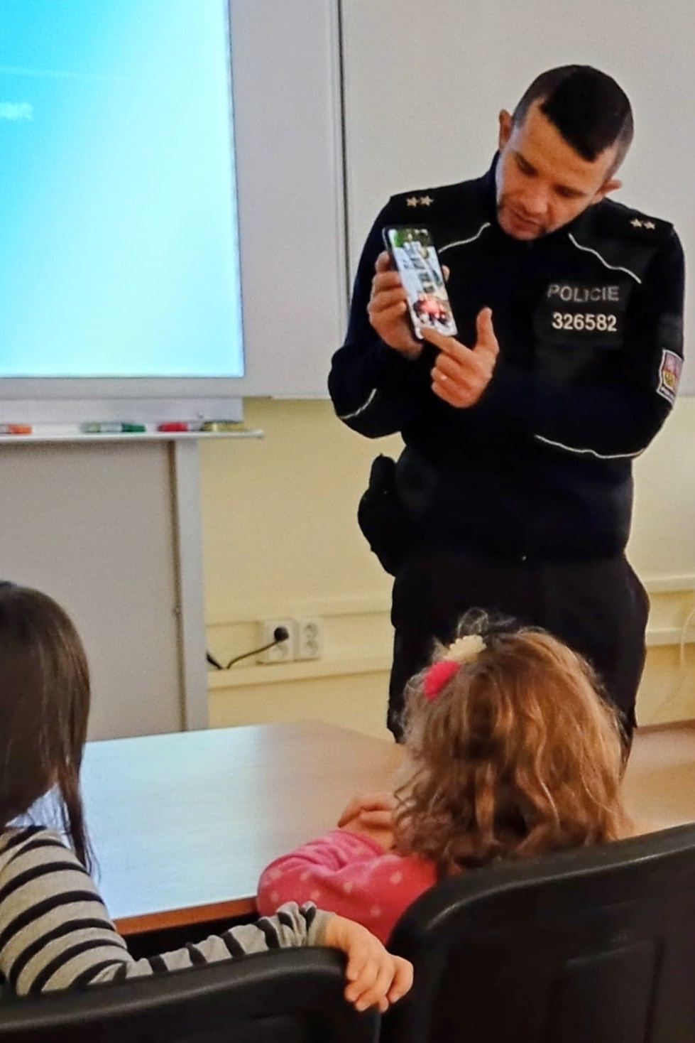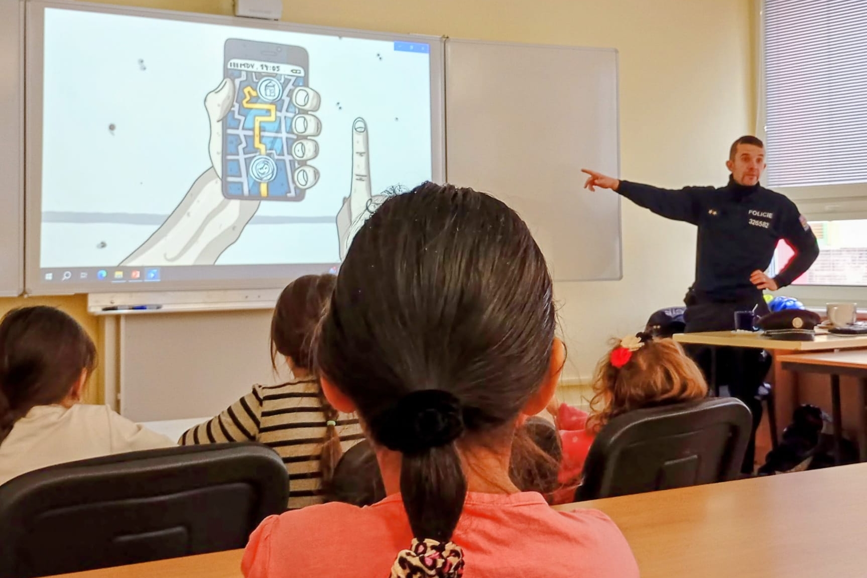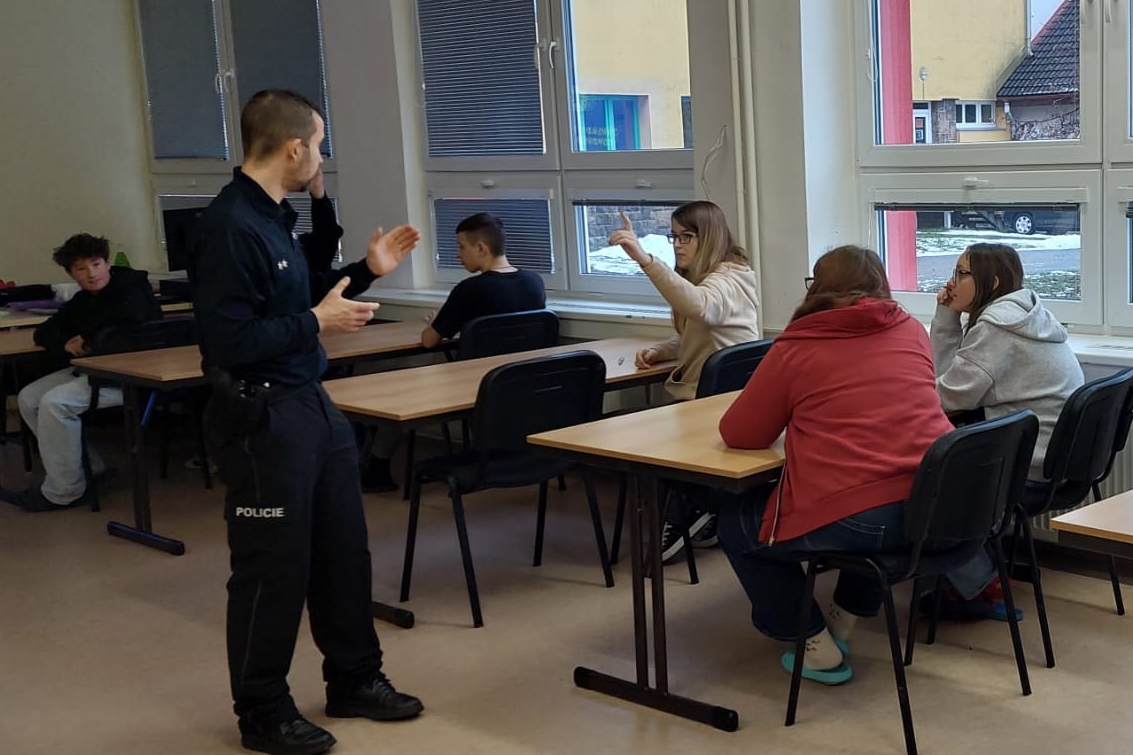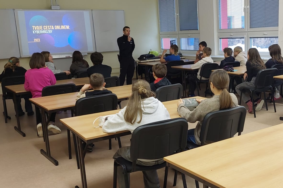 Šesťáci se zaměřili na rizika spojená s on-line světem. Poručík Mervart žákům přiblížil, jak rozpoznat podezřelé chování na internetu, jak se chránit před kyberšikanou a proč je důležité pečlivě zvažovat, co sdílíme na sociálních sítích.