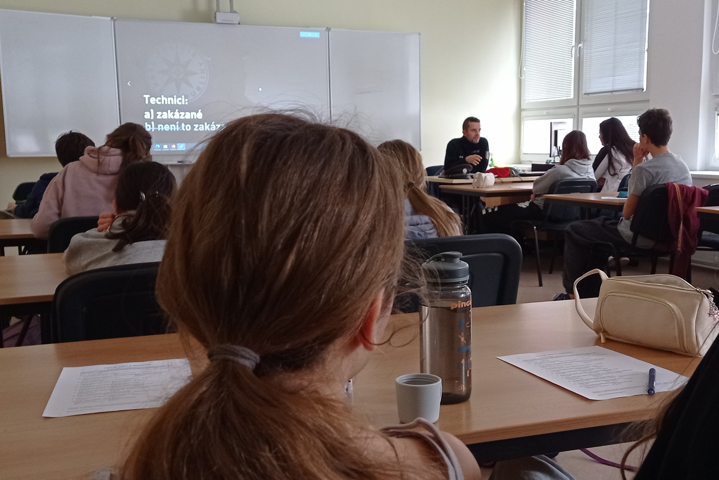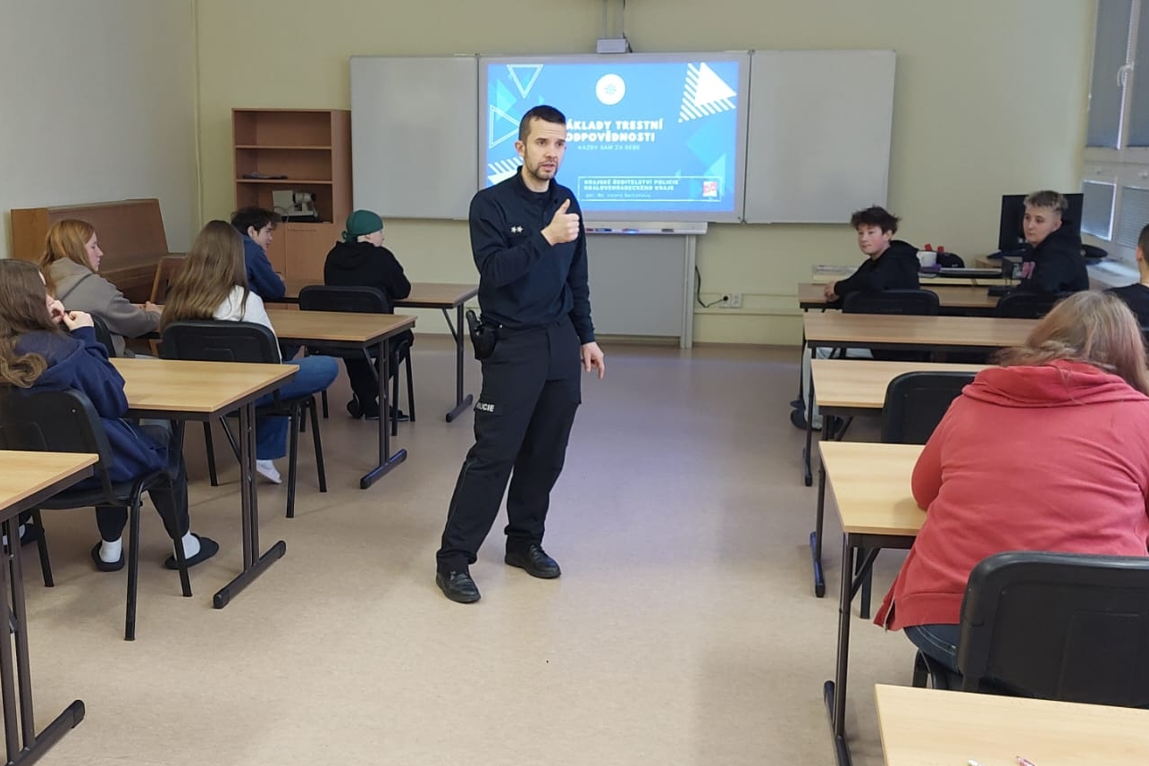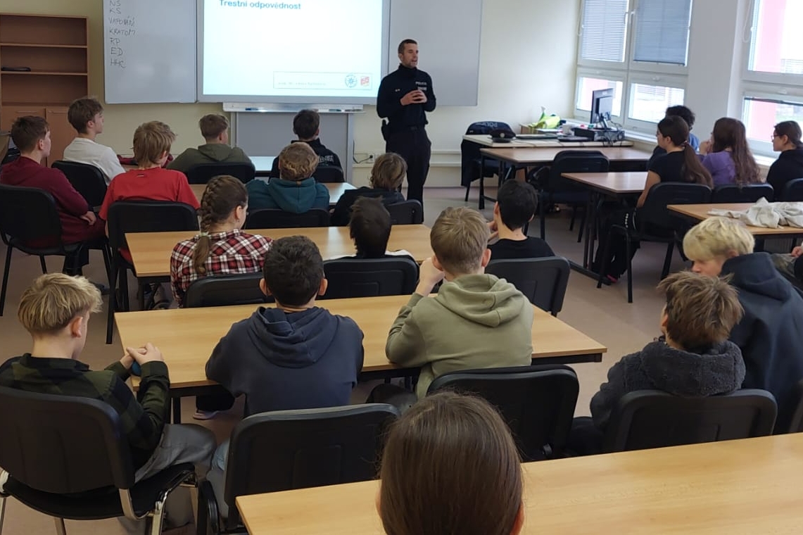 Osmáci se seznámili s tím, jaké mají povinnosti a odpovědnost před zákonem. Pan Mervart vysvětlil rozdíly mezi přestupkem a trestným činem a upozornil na rizika, která mohou mladiství snadno podcenit.