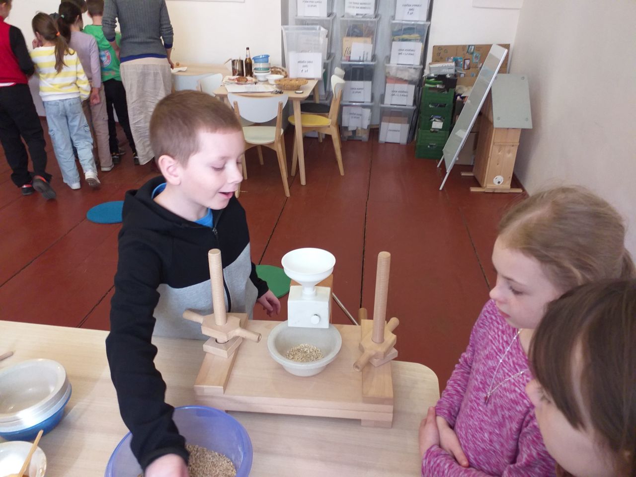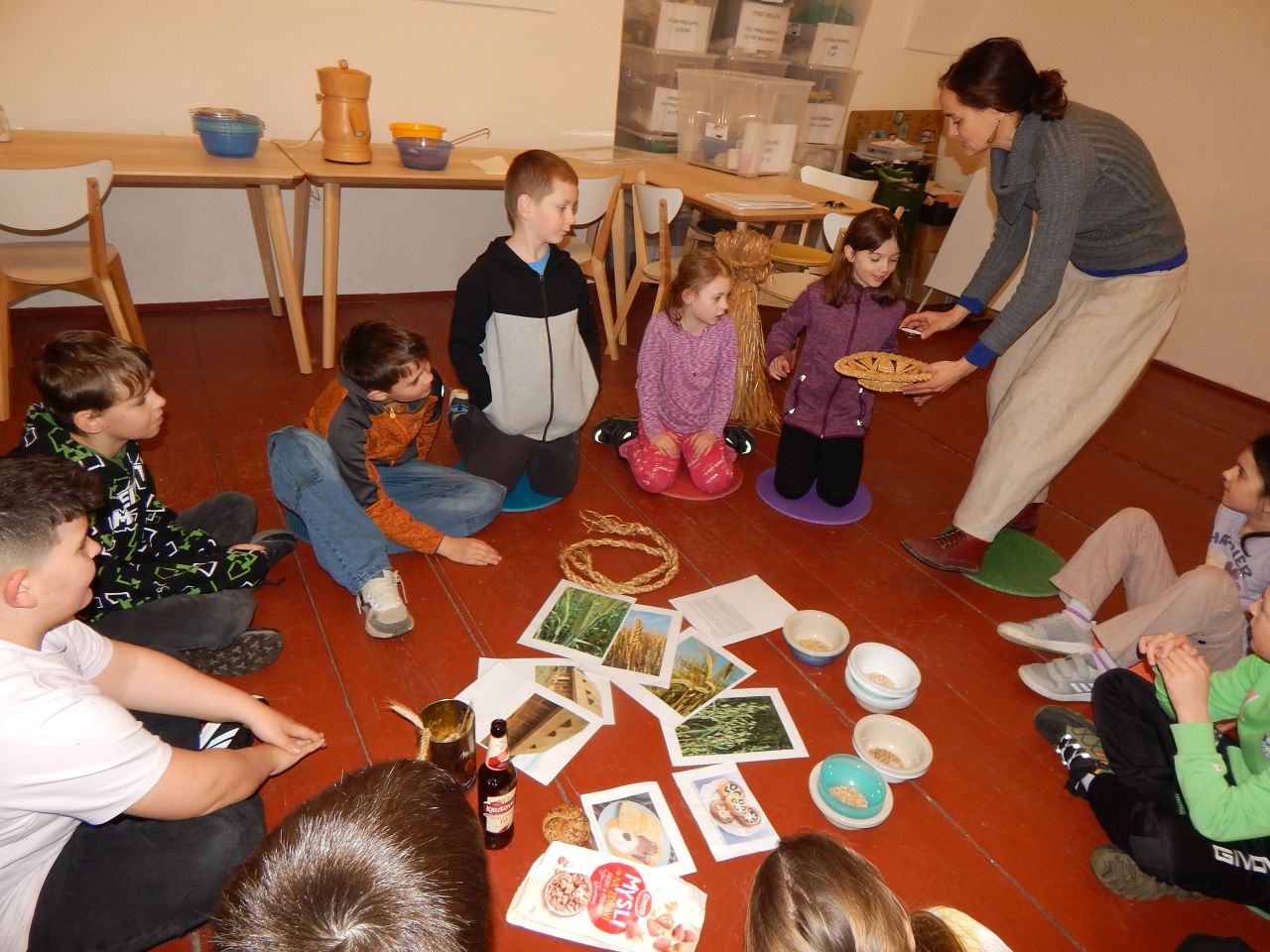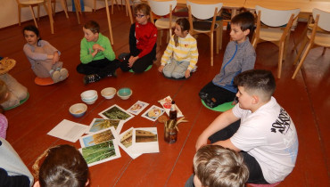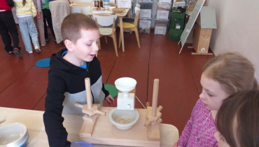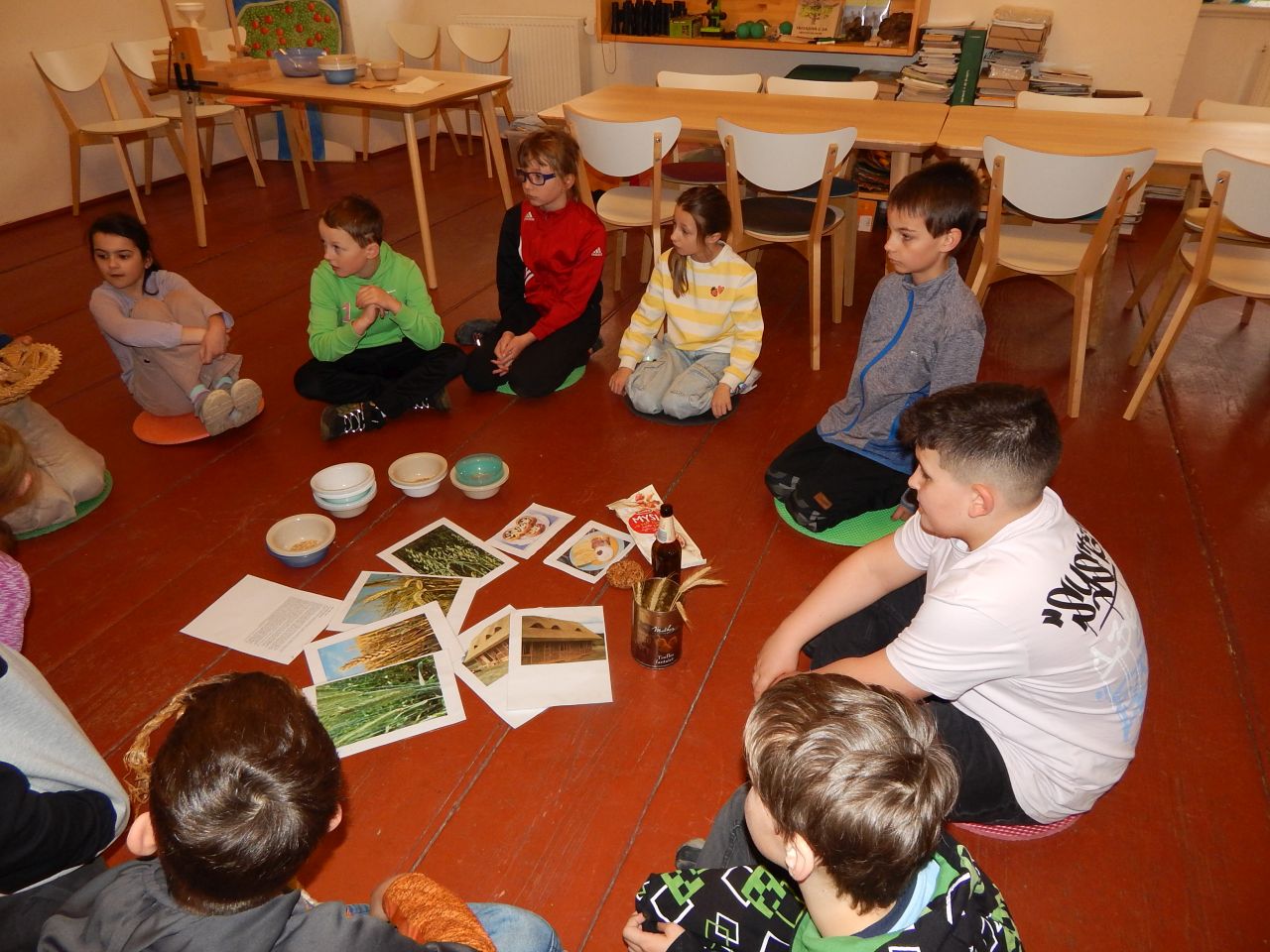 V úterý 17.3. jsme tedy vyrazili do Broumova Za příběhem obilí. Poznali jsme všechny druhy obilí, prošli si cestu, jak se dříve obilí pěstovalo. Od zasetí až po kosení kosou, stavění panáků na poli, svážení žebřiňákem, mlácení cepem i čištění zrna od plev. Pak jsme si sami vyzkoušeli na elektrickém mlýnku umlít pšeničnou mouku a na ručním mlýnku vyrobit ovesné vločky. Ty jsme si ochutili skořicí a přidali si rozinky a hned jsme měli dobré müsli. Mouku i müsli jsme si odnesli domů. Program byl zajímavý a velice se nám líbil.
