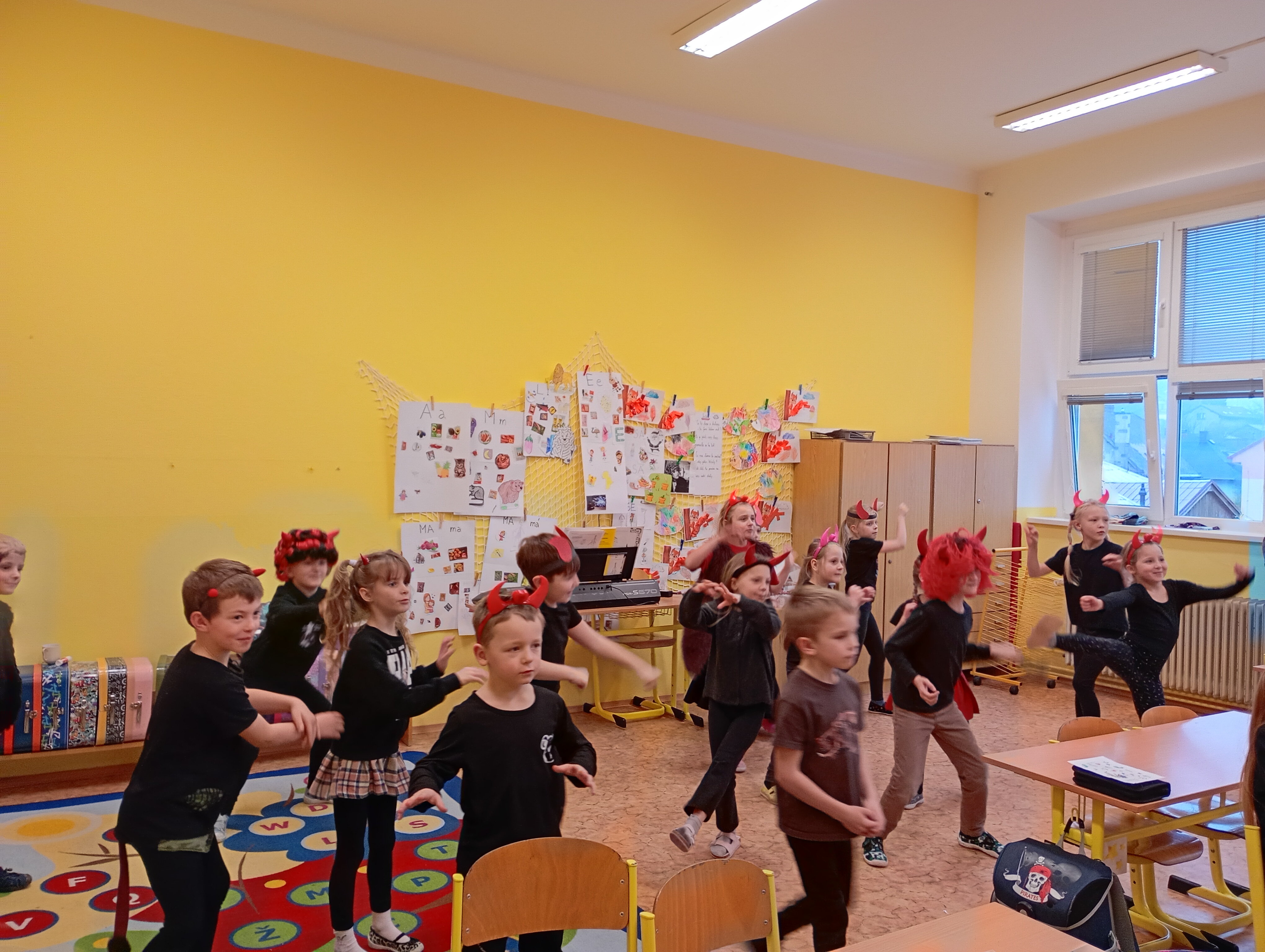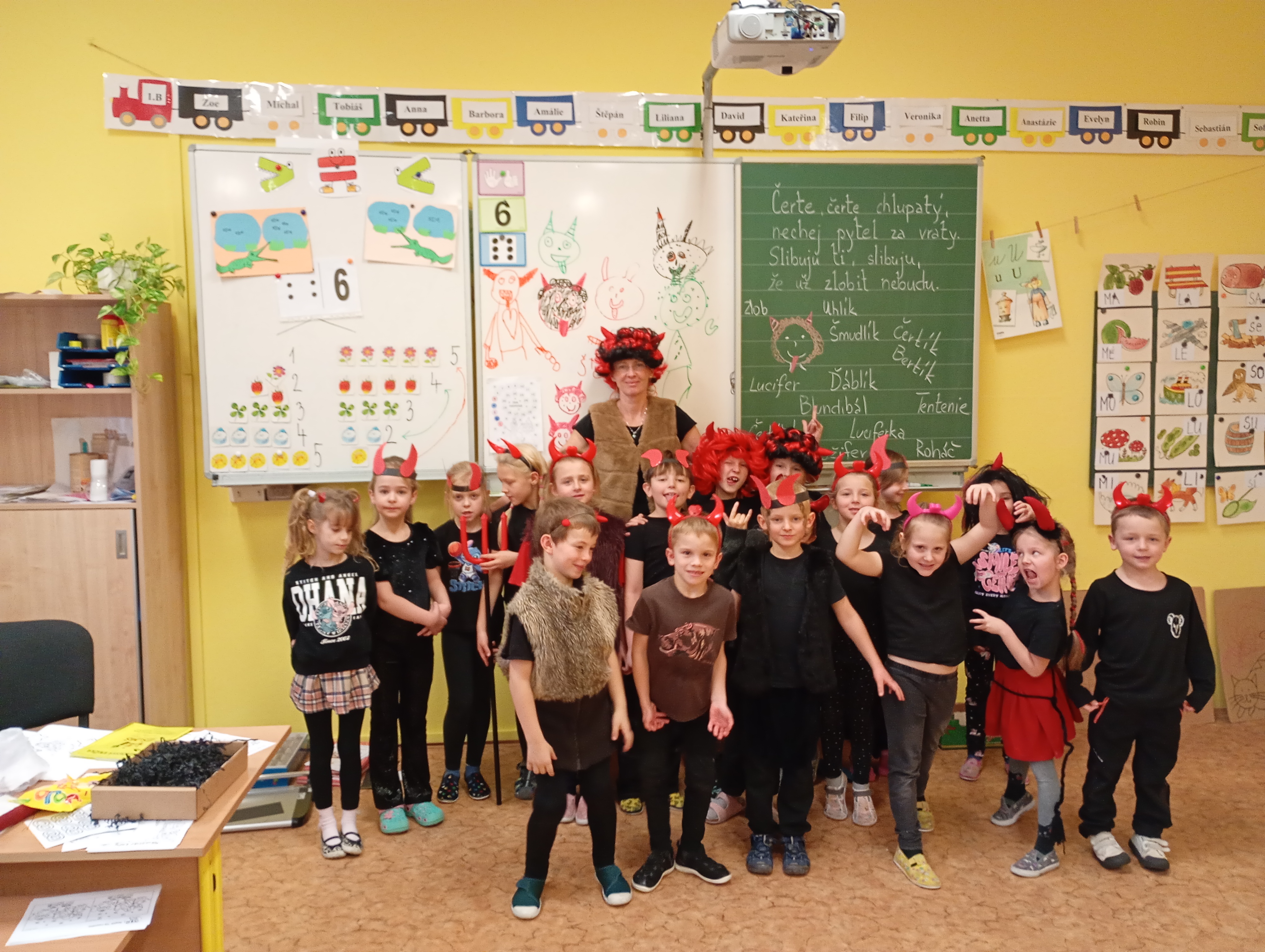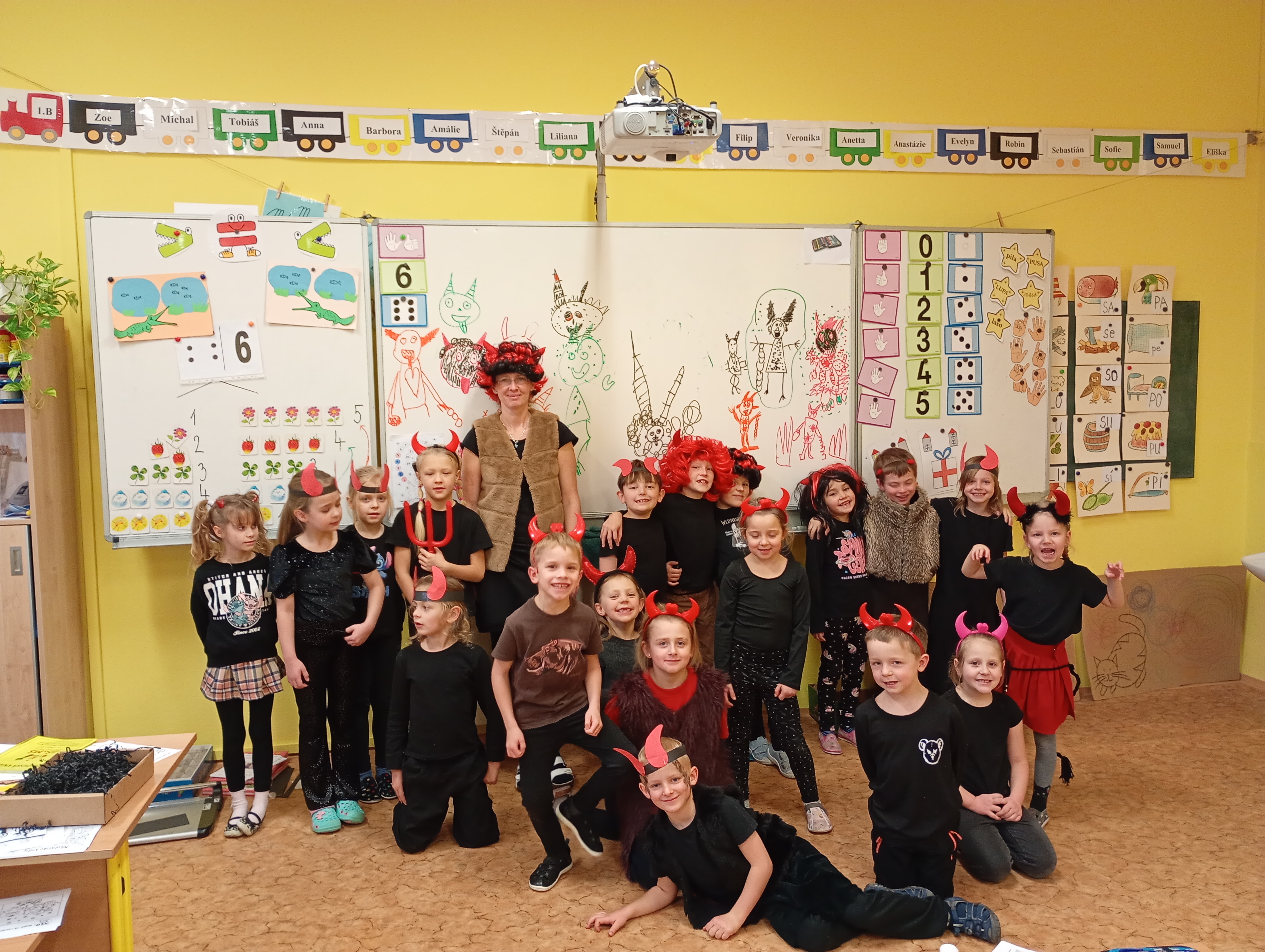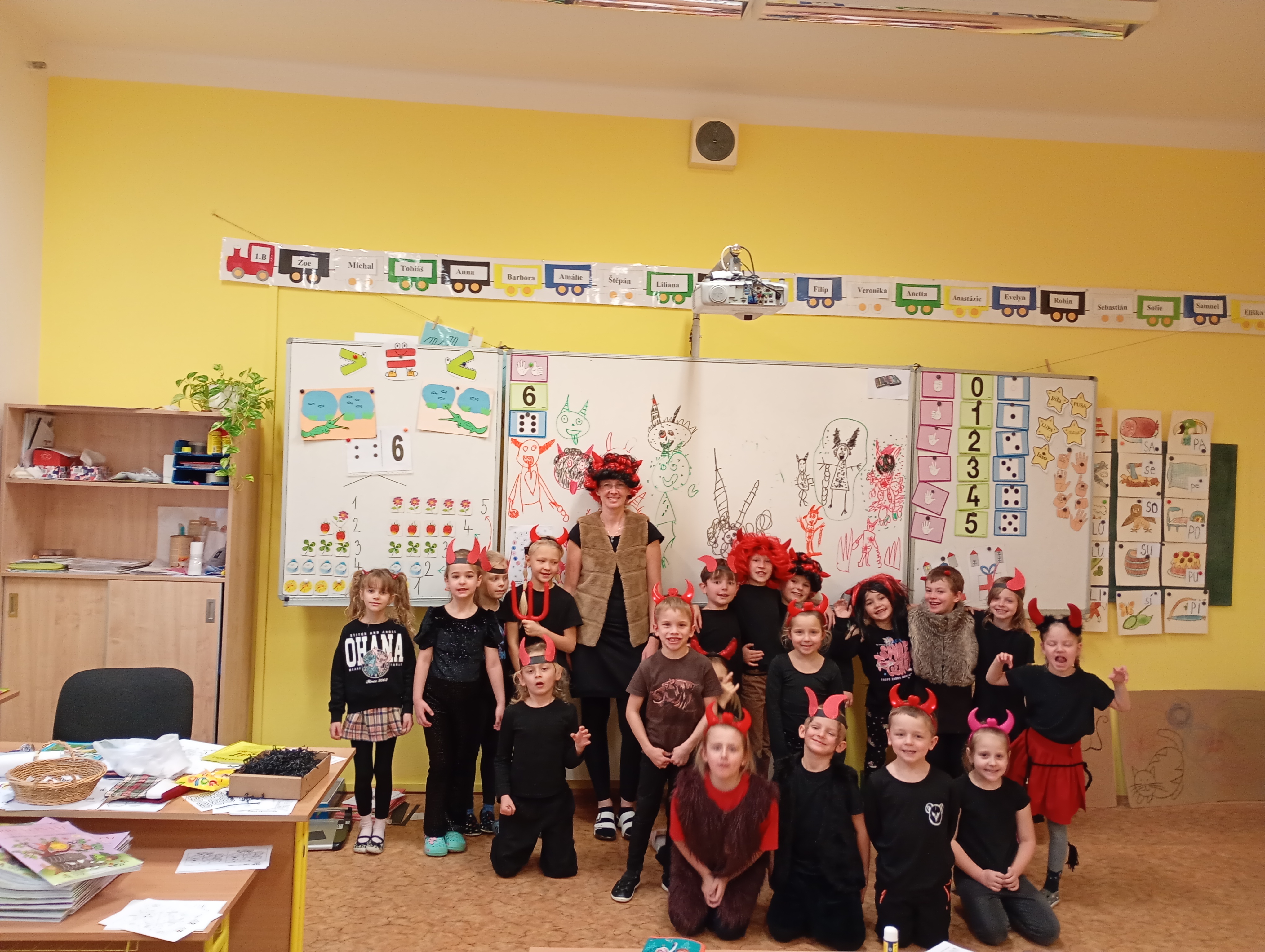 Žáci z prvních tříd si v pátek 5. prosince užili čertí vyučování. Plnili pekelné úkoly, zpívali, tvořili, tancovali, počítali. Děkujeme rodičům malých čertíků za pomoc s oblečením.