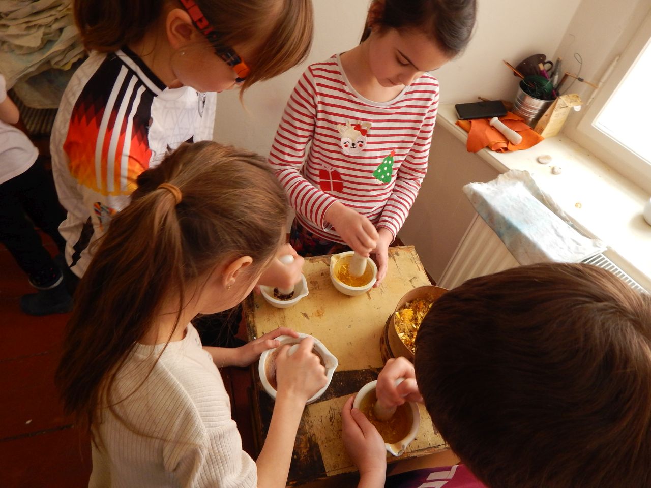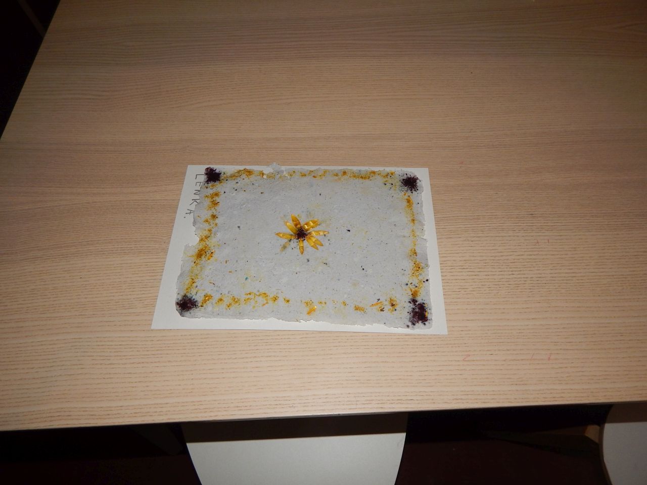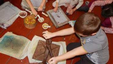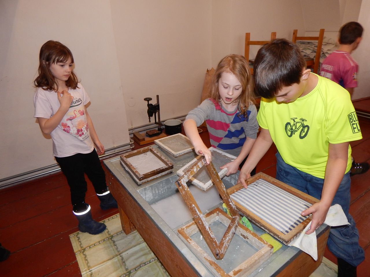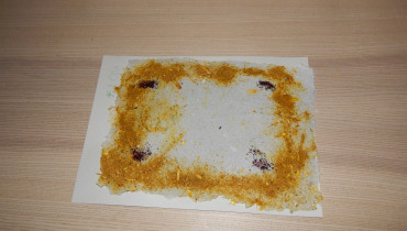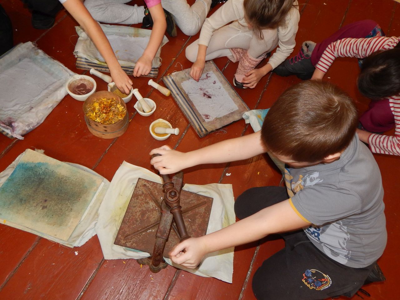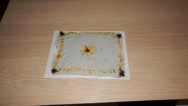 Nejzajímavější pak byla sama ruční výroba papíru a jeho zdobení rozdrcenými květinami. O drcení a práci s lisem jsme projevili opravdu velký zájem a moc nás tyto činnosti bavily. Každý si pak jako dárek odnesl svůj výrobek.