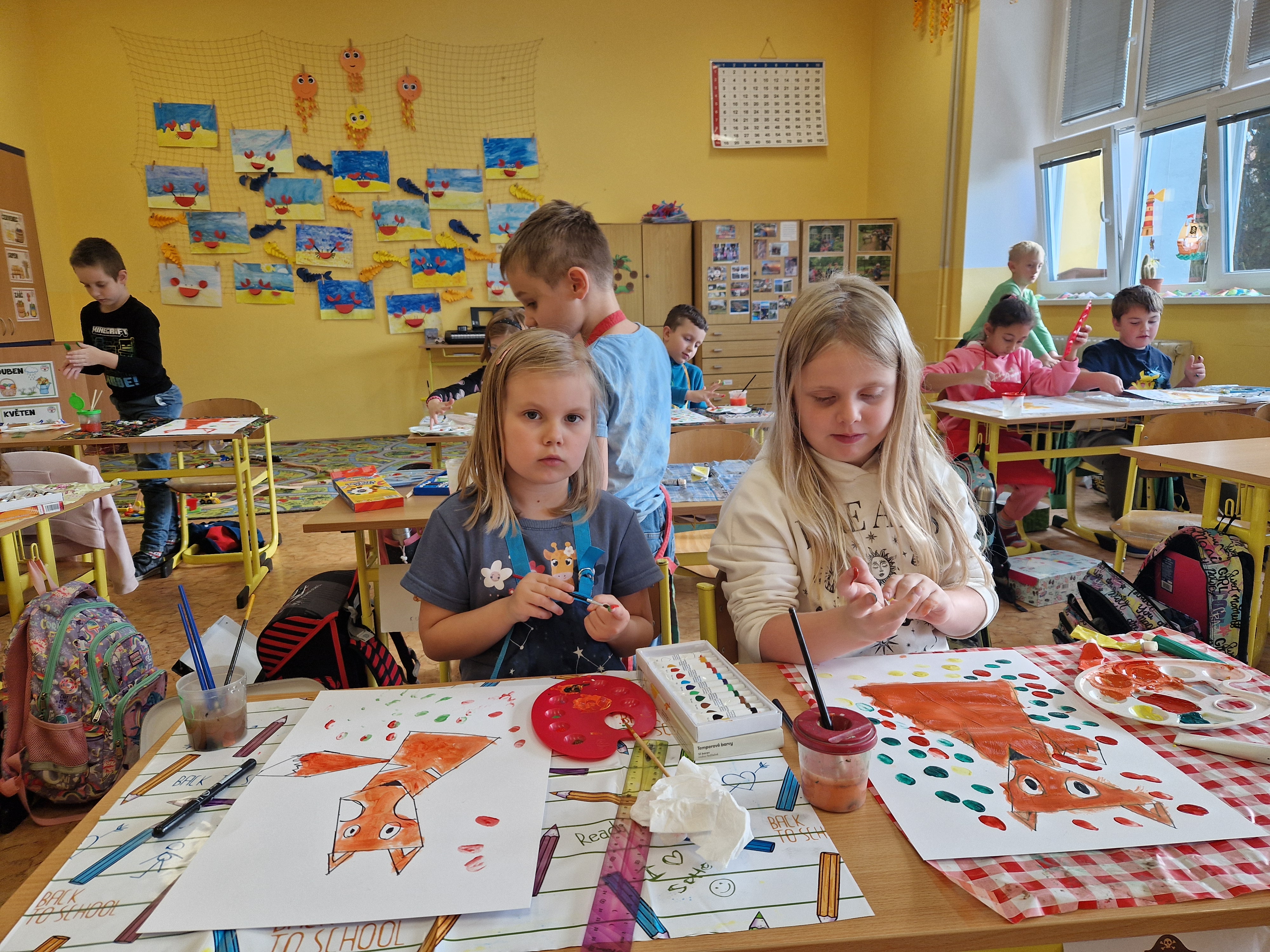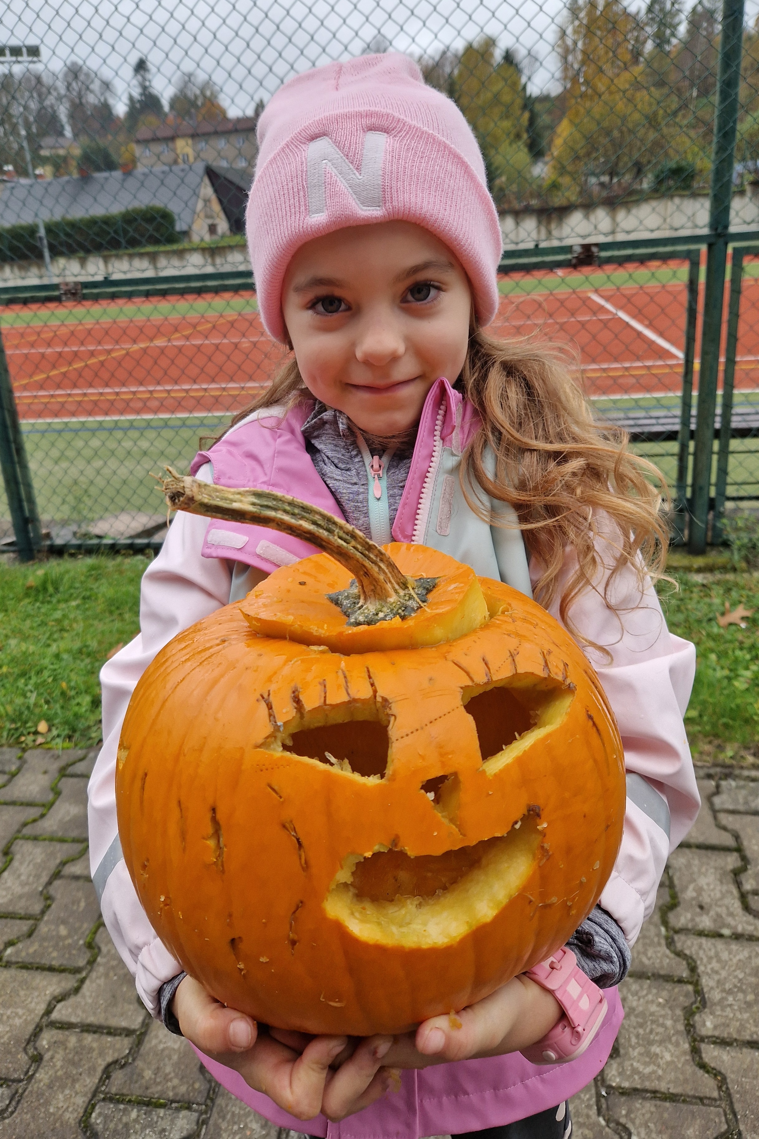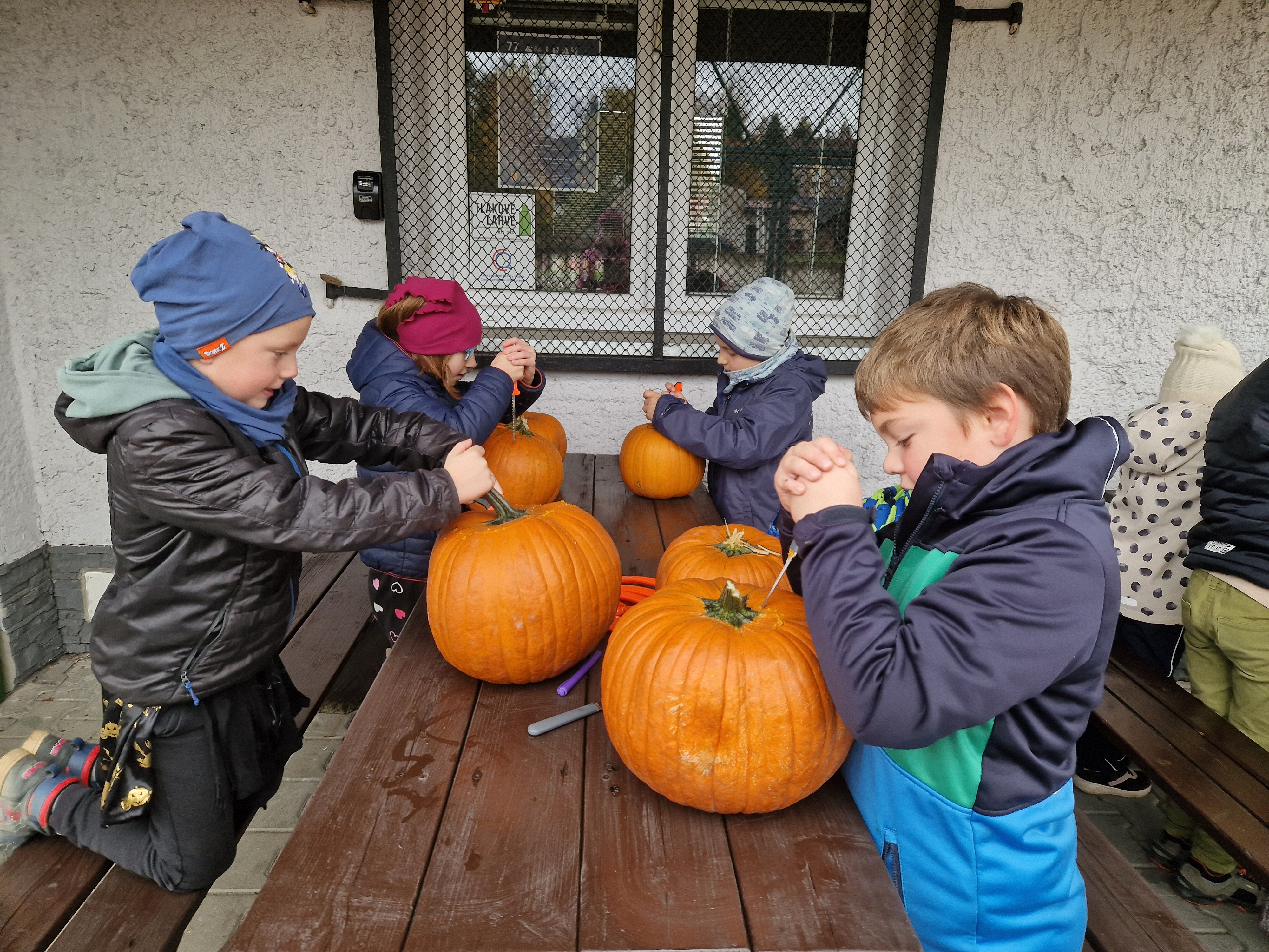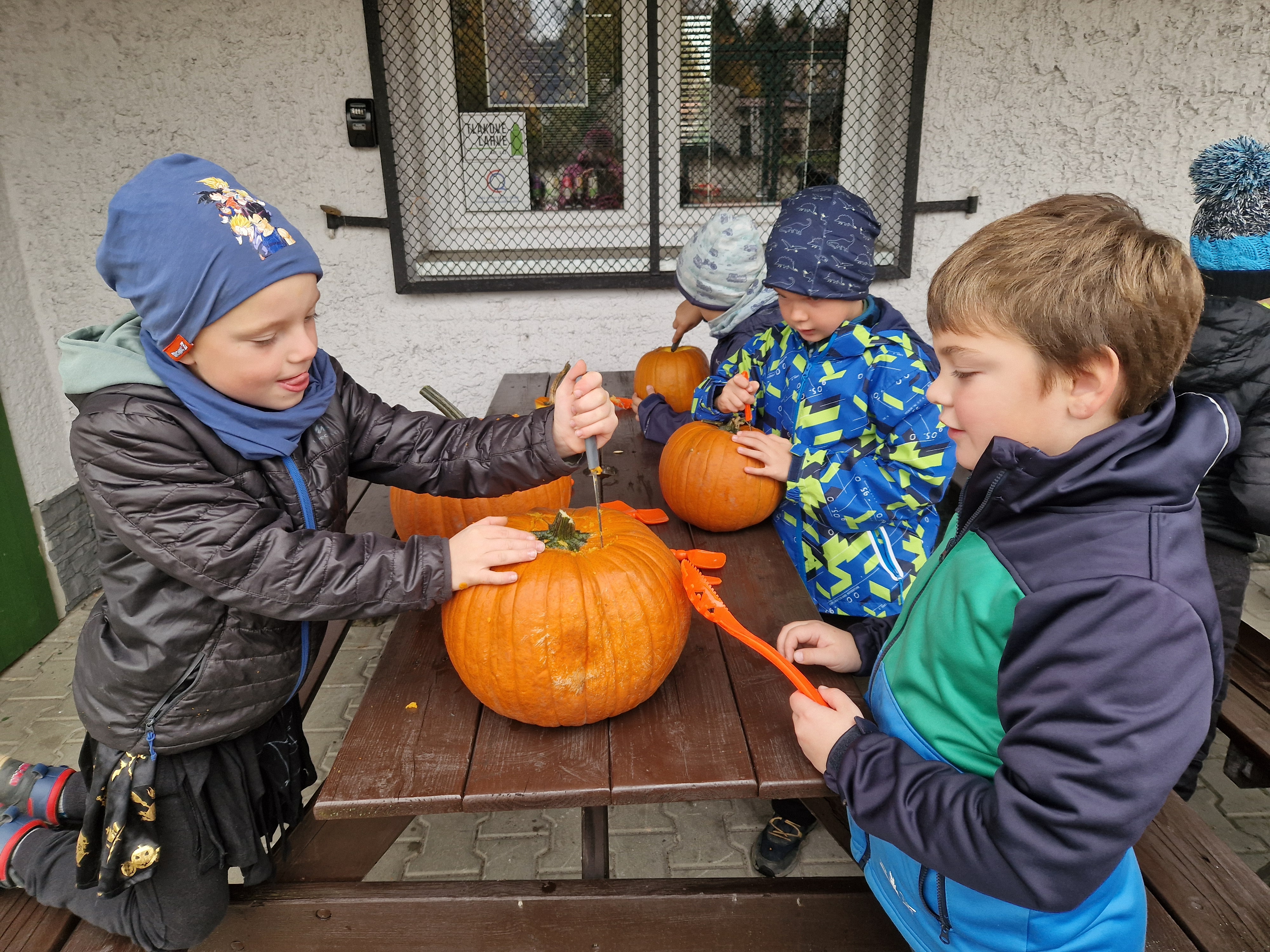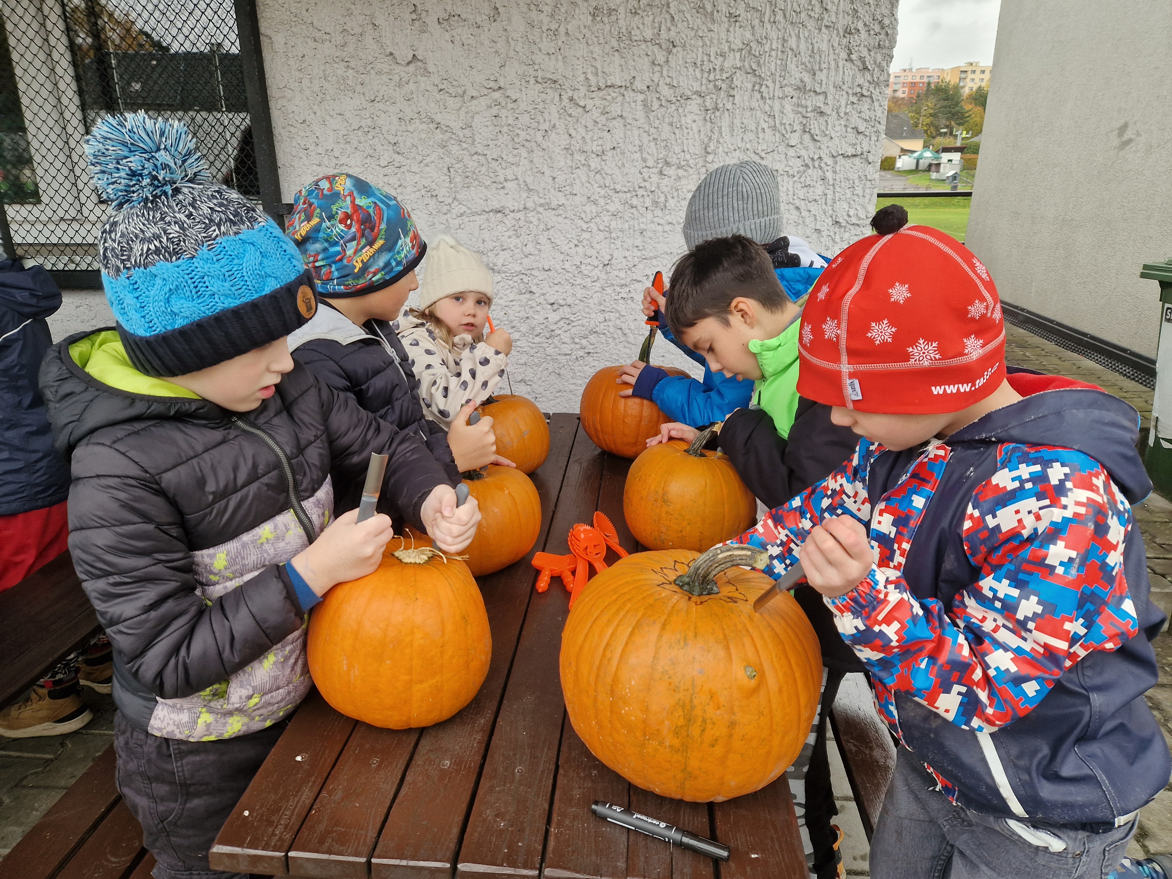 Na začátku října jsme navštívili knihovnu. Paní knihovnice dětem přečetla pohádku Jak Křemílek s Vochomůrkou vařili povidla. Během pohádky děti plnily úkoly a zapojily se do děje. Po pohádce si děti dle svého výběru půjčily knihy a kousek si přečetly. Během hodin estetiky jsme ve škole tiskli podzimní listy a jablíčka. Malovali jsme žaludy, rýsovali lišku, kde děti využily nové zkušenosti s pravítkem. Tvořili jsme ježky a dělali podzimní lesní omalovánku. Halloween jsme také stihli oslavit. Děti si úplně samy vydlabaly dýně na víceúčelovém hřišti. Moc se jim povedly a měly z nich radost! Ve třídě jsme si zahrály i naučné halloweenské hry - řazení jmen čarodějnic dle abecedy, čtení s porozuměním a přiřazování k halloweenským maskám a spoustu dalšího.