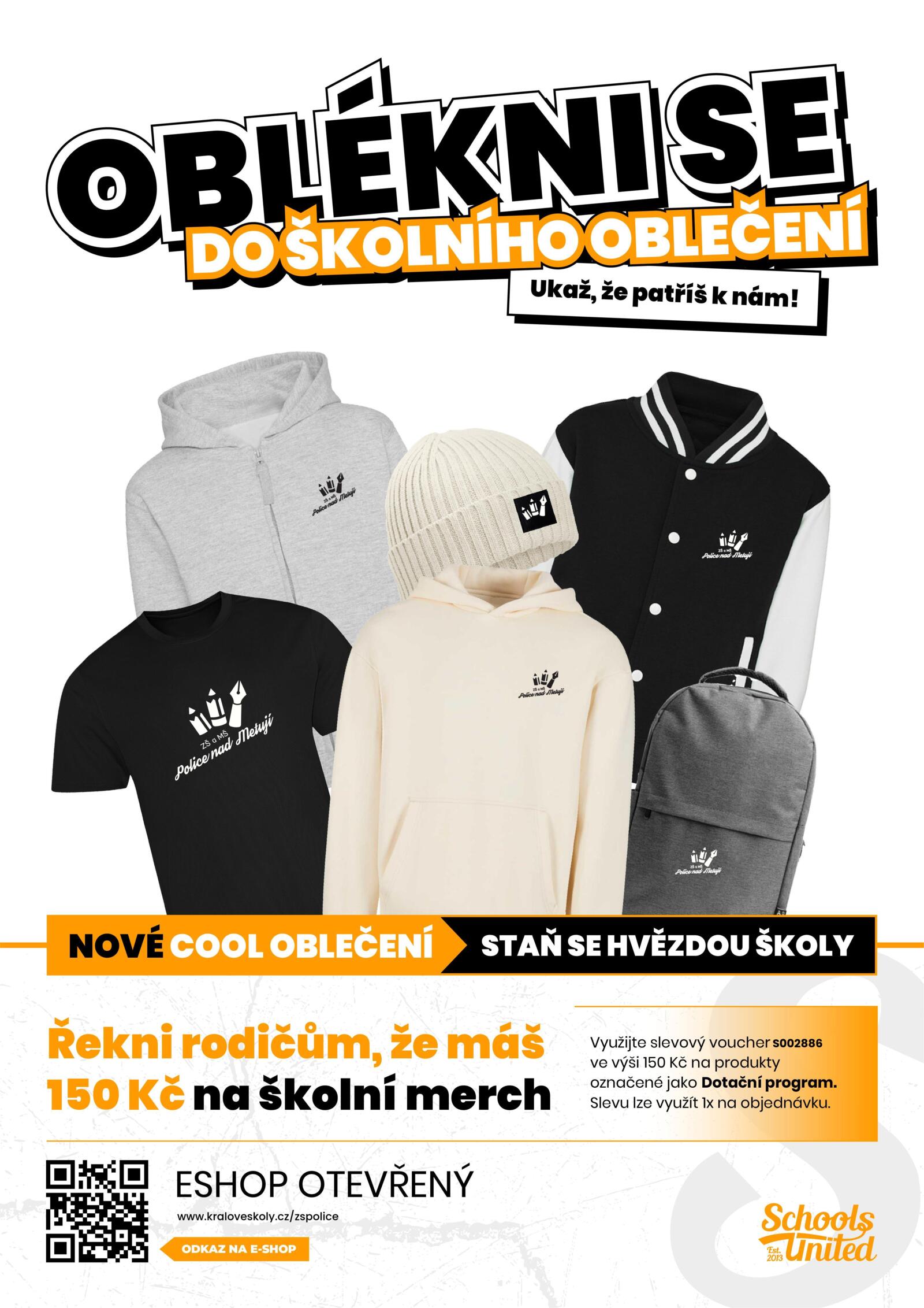 Nechali jsme vytvořit vlastní volnočasovou školní kolekci oblečení, jejíž náhled naleznete níže. Oblečení je možné zakoupit prostřednictvím našeho e‑shopu na adrese: https://www.kraloveskoly.cz/zspolice/