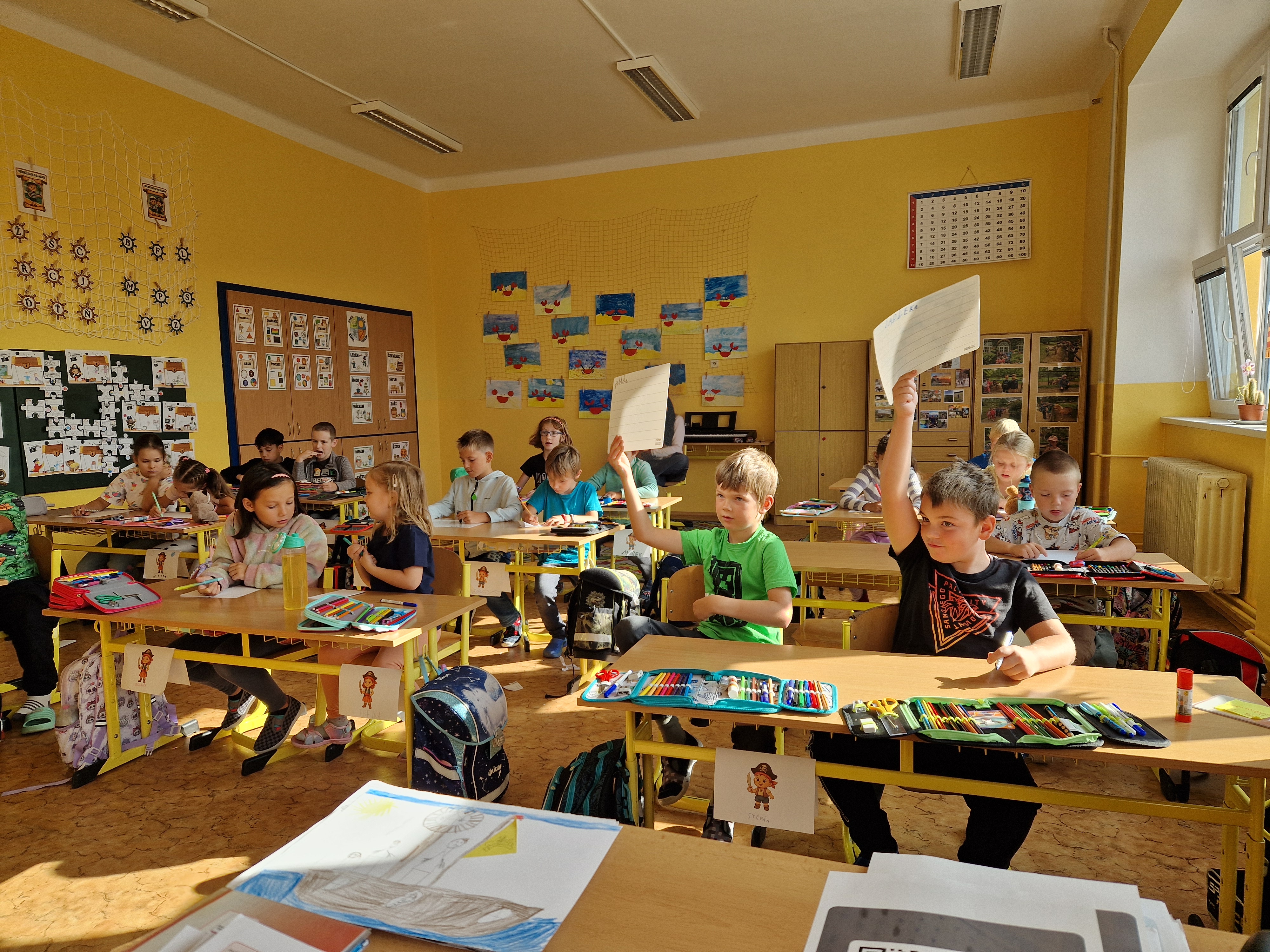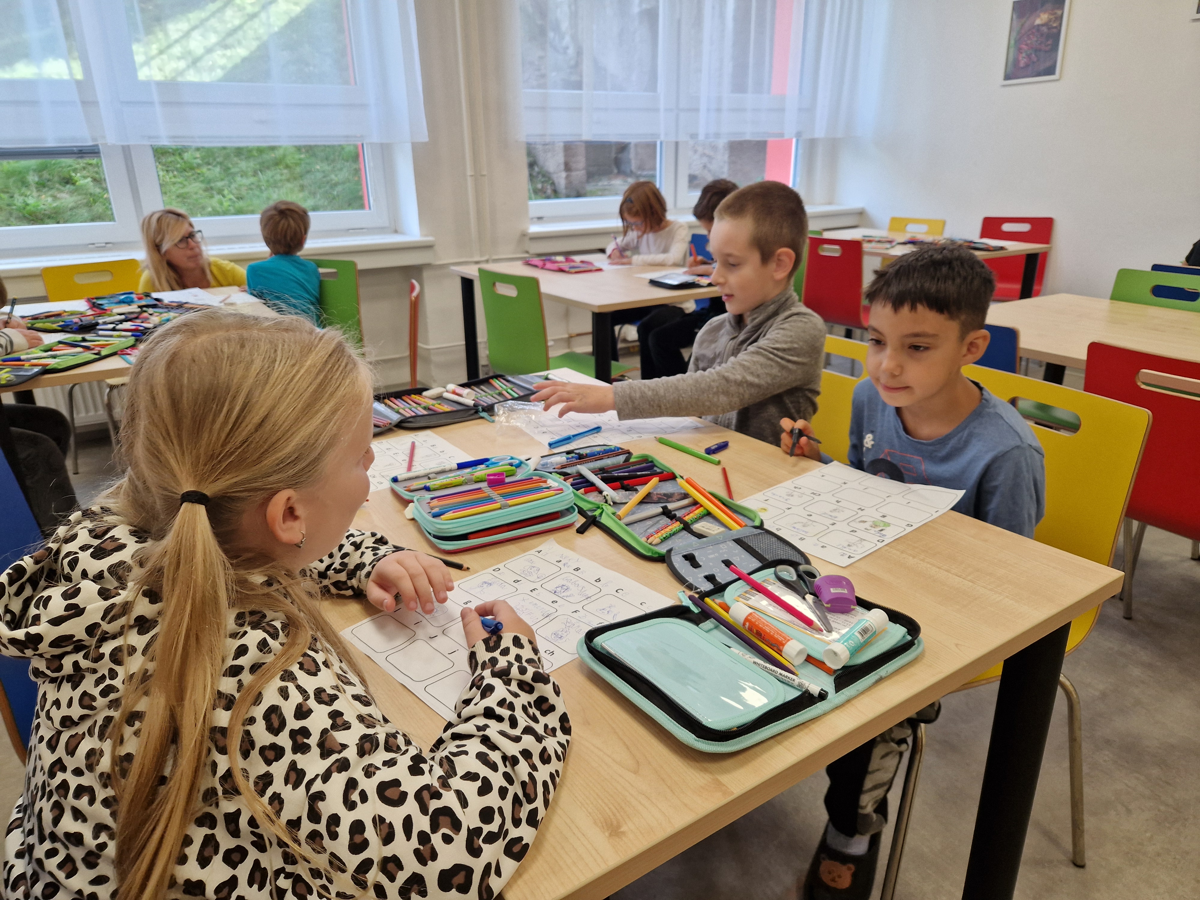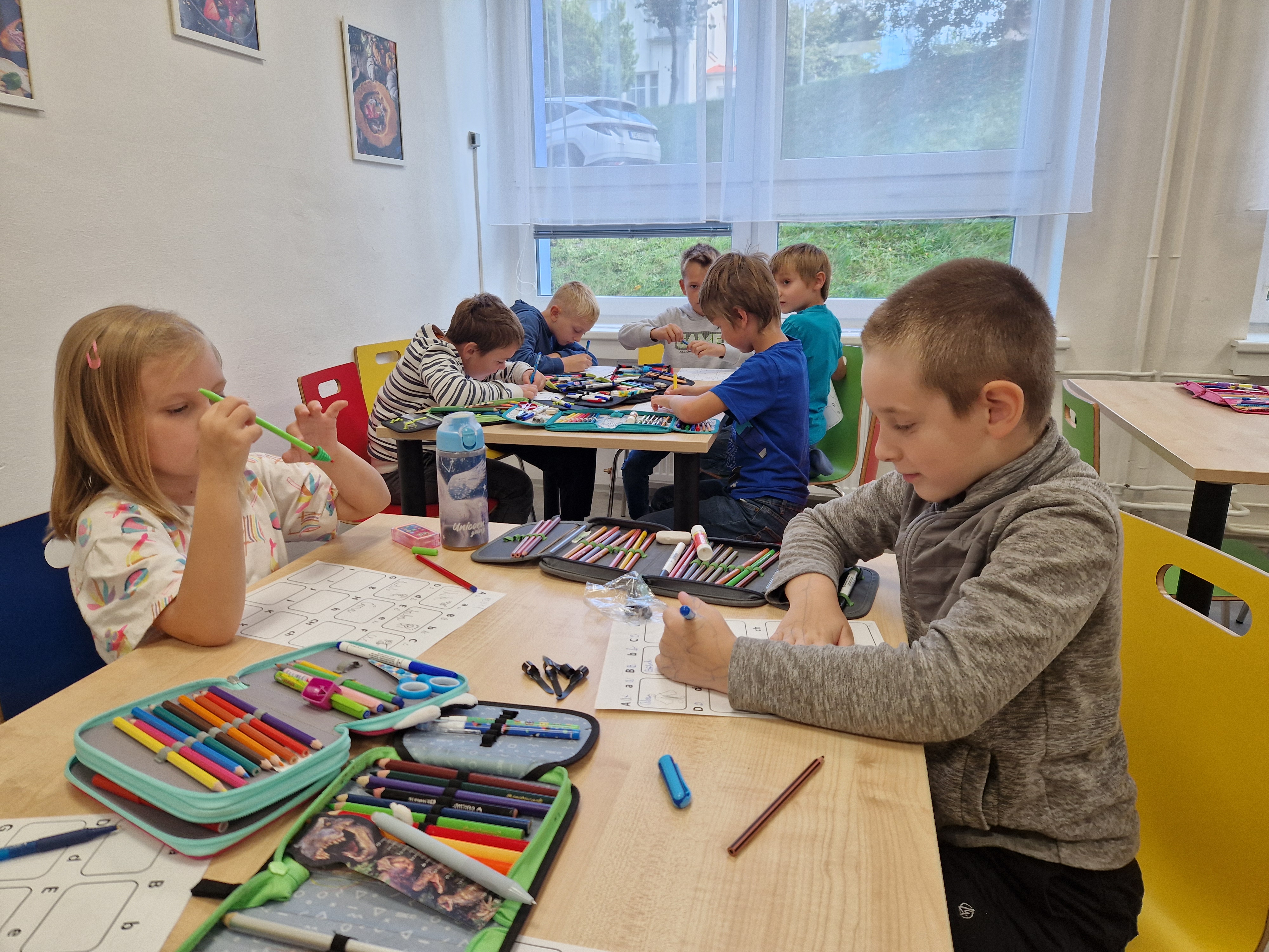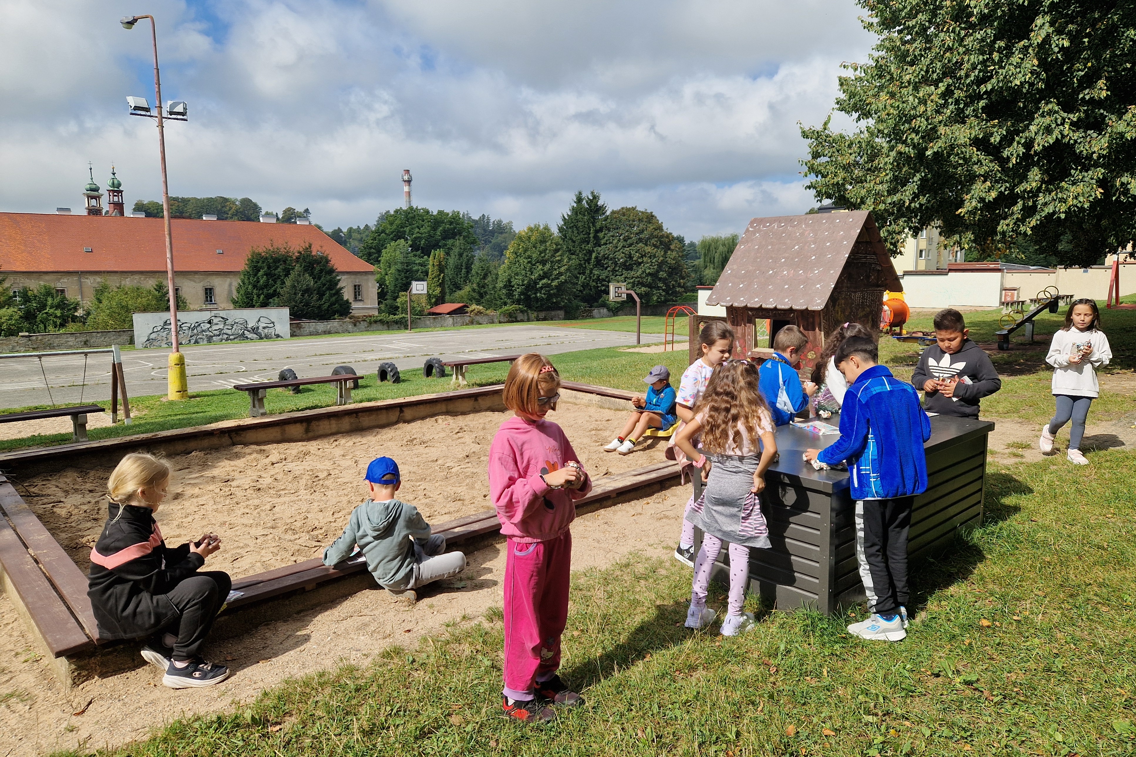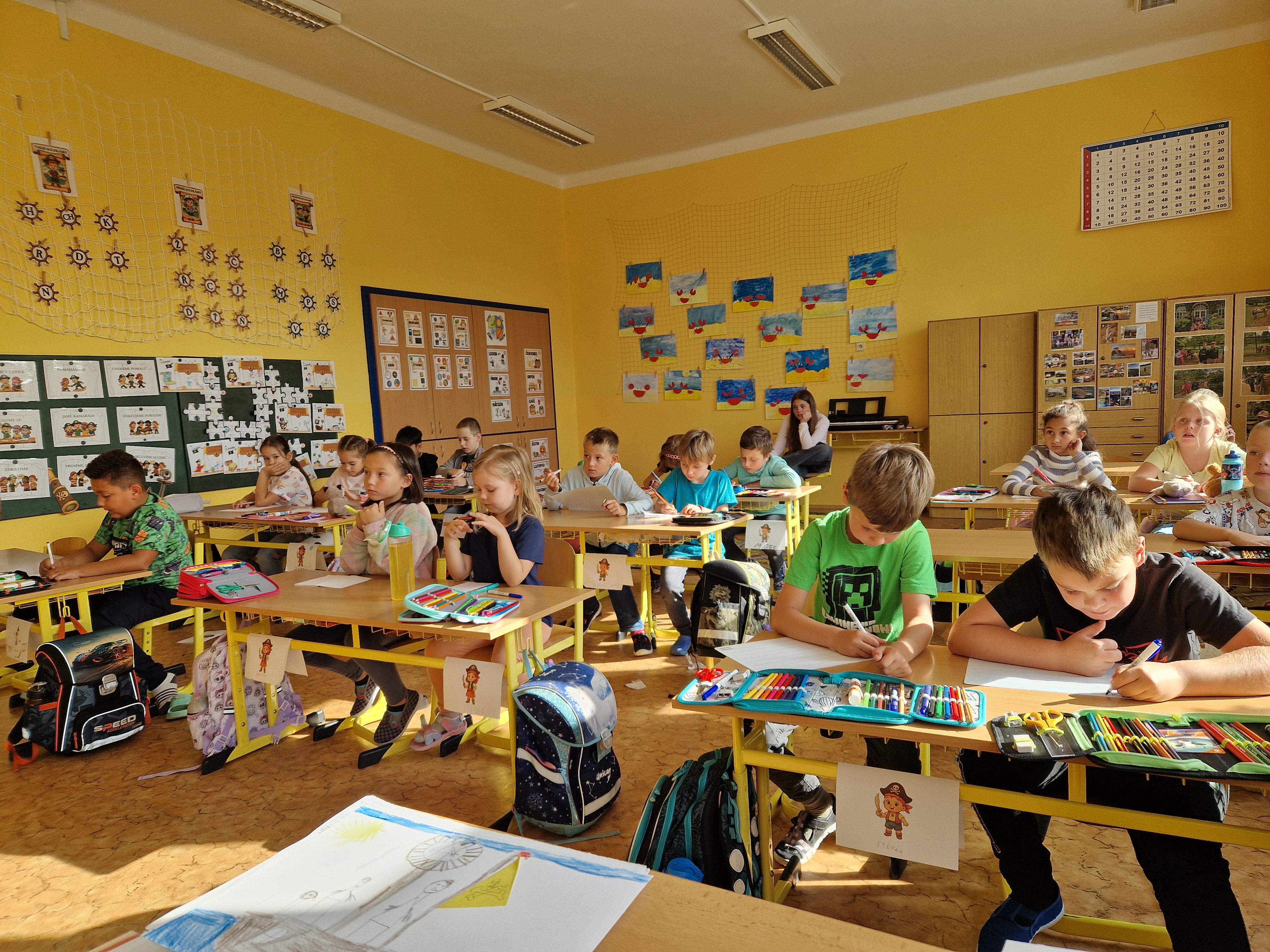 Tento školní rok nás bude provázet téma piráti. Celé září jsme proto zdobili třídu touto tématikou. Vyráběli jsme ryby, žraloky, chobotnice, medúzy a kraby. Vymýšleli jsme si společně pirátská pravidla, která jsou důležitá, aby nám všem bylo ve třídě dobře. První týden jsme vyrazili na pirátskou stezku a plnili během ní různé úkoly. Na konci nás čekal za odměnu poklad. Také nás jeden den učili žáci devátých ročníků - dětem se tento den moc líbil. Třetí týden v září jsme využili hezkého počasí a vyrazili na výlet na Slavný. Poznávali jsme po cestě stromy a keře, dali si svačinu na skalách a postavili domečky pro skřítky. Navštívili jsme také Zahrádkářskou výstavu v Pellyho domech, kde jsme si zopakovali ovoce a zeleninu našich zahrádek, prohlédli si květiny, kaktusy a koutek M. D. Rettigové. A nesměl chybět pokrm z mrkve- mrkvová buchta, kterou jsme společně upekli ve školní kuchyňce a pak také s chutí společně snědli.
