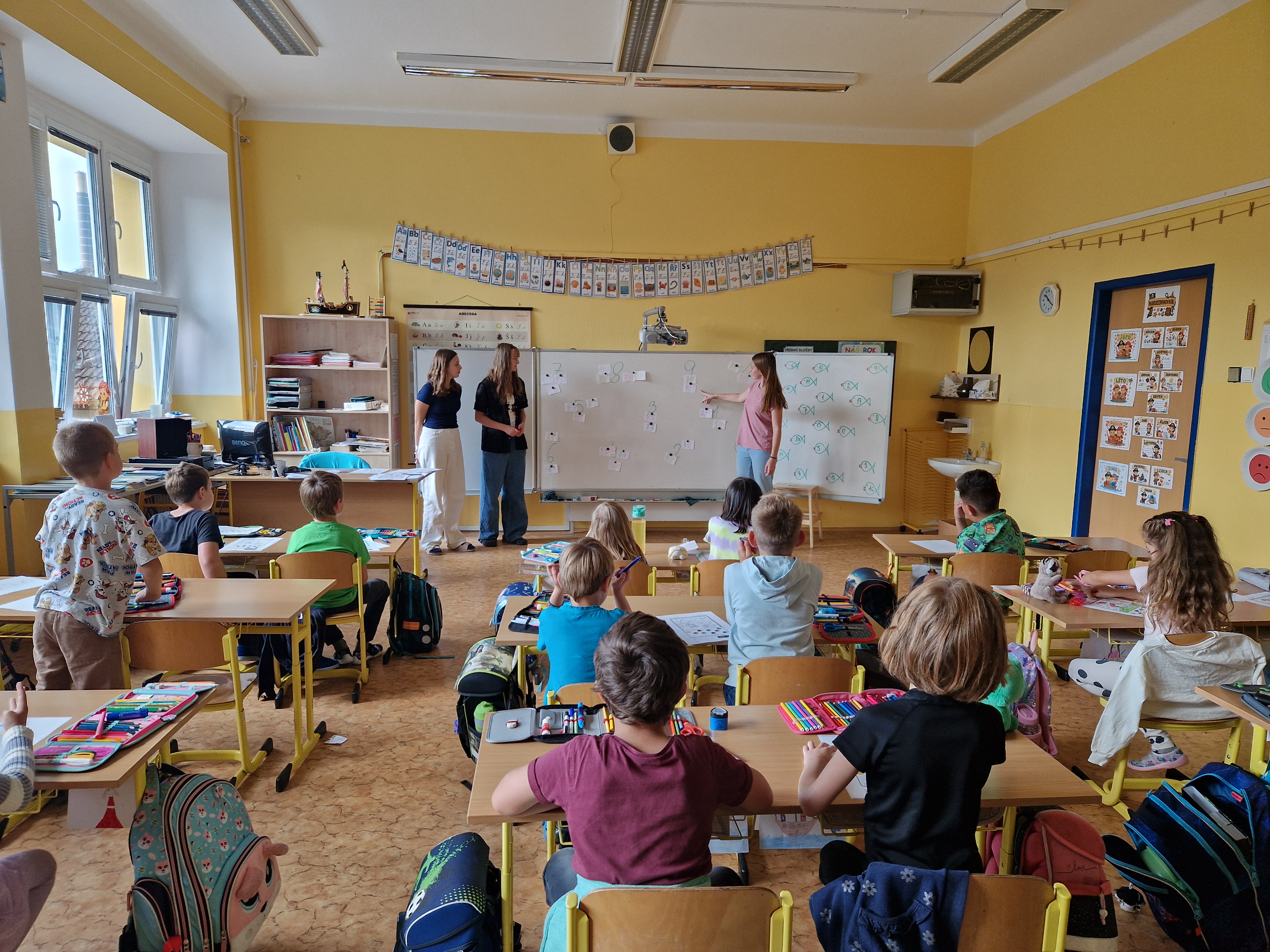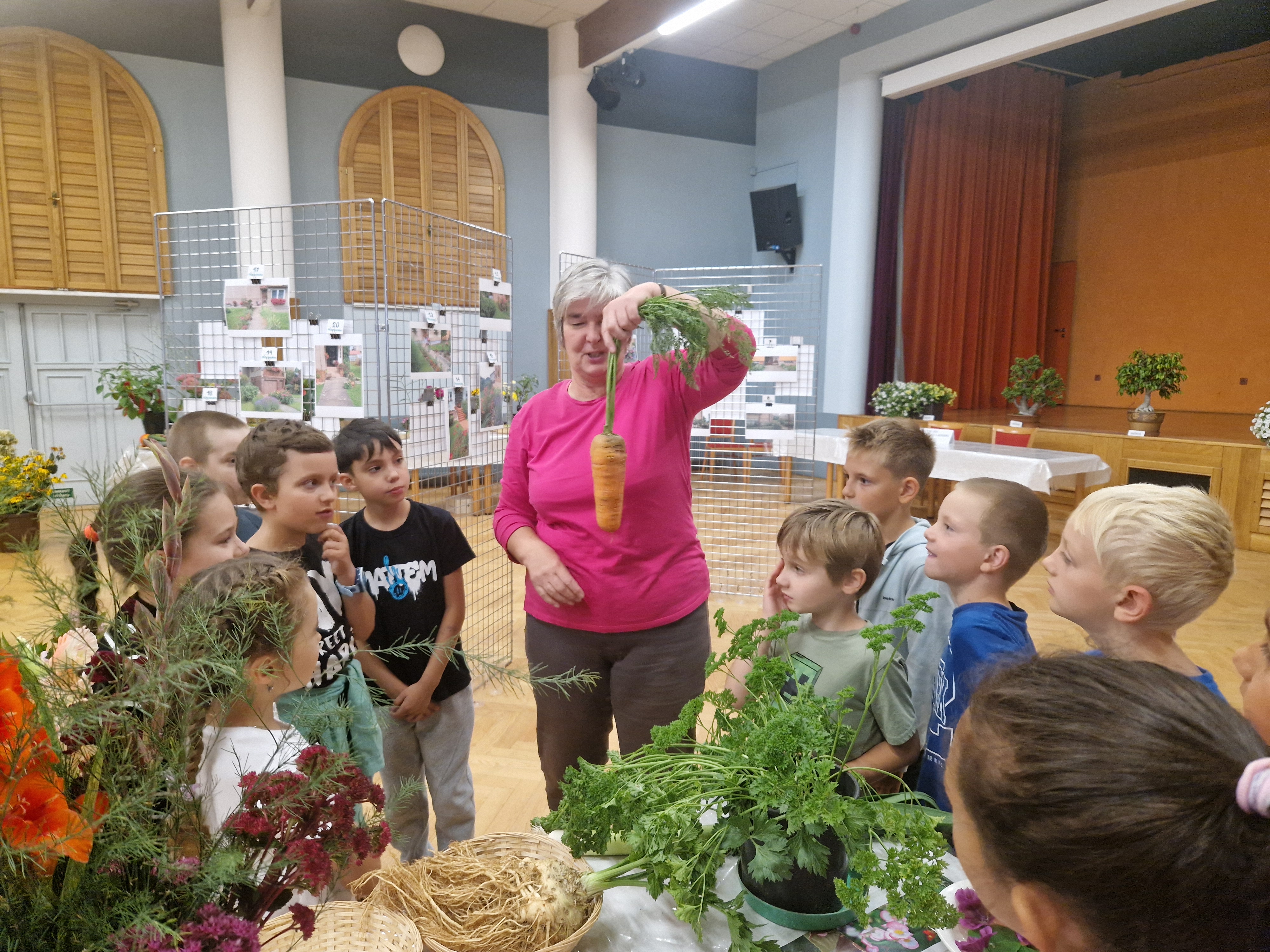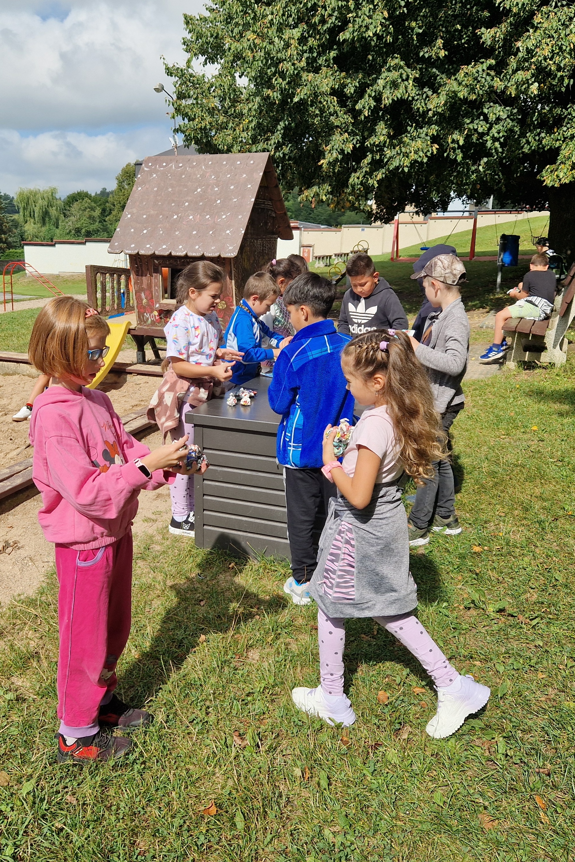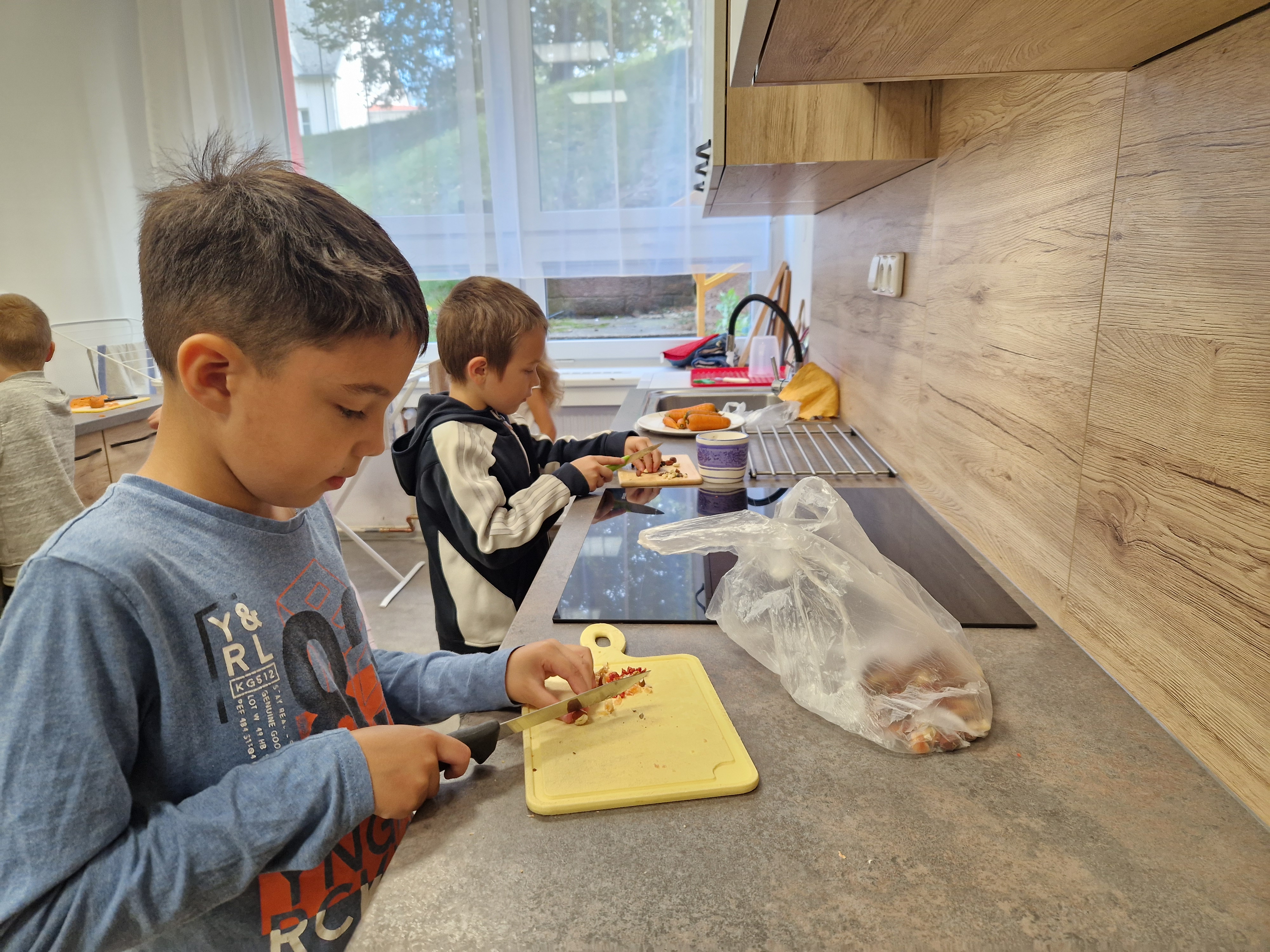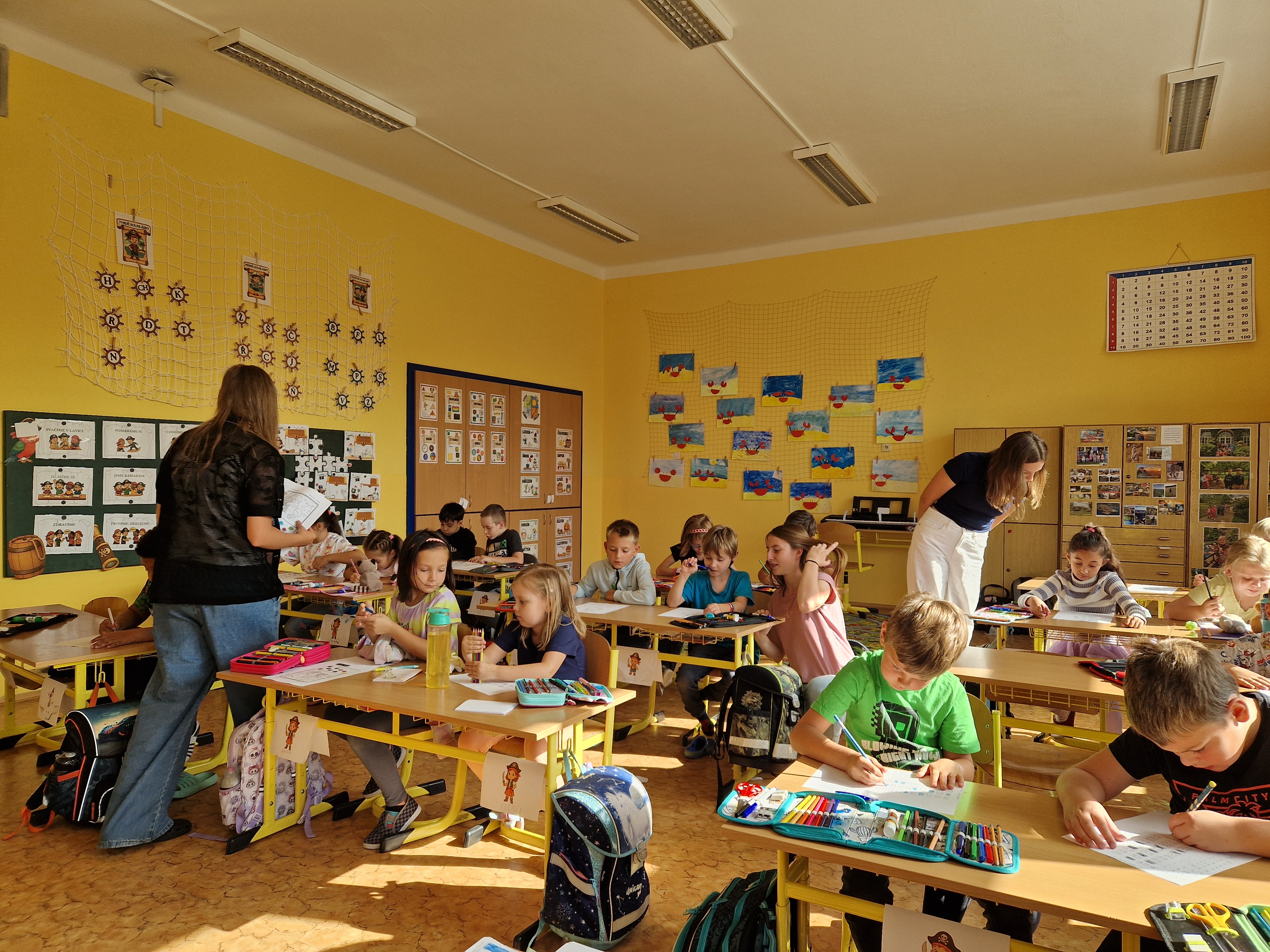Tento školní rok nás bude provázet téma piráti. Celé září jsme proto zdobili třídu touto tématikou. Vyráběli jsme ryby, žraloky, chobotnice, medúzy a kraby. Vymýšleli jsme si společně pirátská pravidla, která jsou důležitá, aby nám všem bylo ve třídě dobře. První týden jsme vyrazili na pirátskou stezku a plnili během ní různé úkoly. Na konci nás čekal za odměnu poklad. Také nás jeden den učili žáci devátých ročníků - dětem se tento den moc líbil. Třetí týden v září jsme využili hezkého počasí a vyrazili na výlet na Slavný. Poznávali jsme po cestě stromy a keře, dali si svačinu na skalách a postavili domečky pro skřítky. Navštívili jsme také Zahrádkářskou výstavu v Pellyho domech, kde jsme si zopakovali ovoce a zeleninu našich zahrádek, prohlédli si květiny, kaktusy a koutek M. D. Rettigové. A nesměl chybět pokrm z mrkve- mrkvová buchta, kterou jsme společně upekli ve školní kuchyňce a pak také s chutí společně snědli.